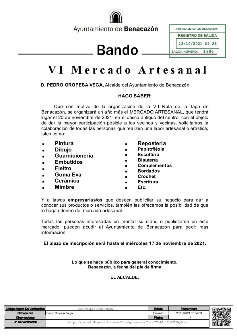 El Ayuntamiento de Benacazón informa que, con motivo de la organización de la VII Ruta de la Tapa de Benacazón -que se celebrará del 18 al 21 y del 25 al 28 de Noviembre-, se organizará un año más el MERCADO ARTESANAL, que tendrá lugar el 20 de noviembre de 2021, en el casco antiguo de Benacazón.