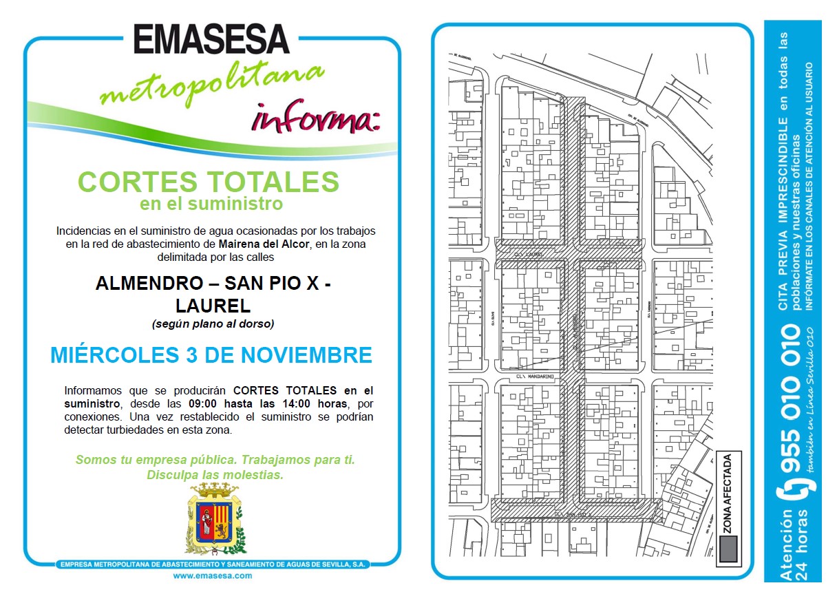 Emasesa Metropolitana informa que por trabajos en la red de abastecimiento, el miércoles día 3 de noviembre, de 9 a 14 horas, se producirán cortes totales en el suministro de agua en la zona comprendida por las calles Almendro, San Pío y Laurel.