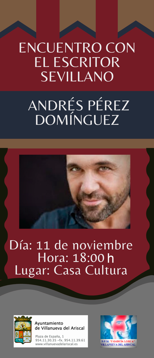 Te invitamos al encuentro que tendremos el próximo jueves 11 de noviembre con el escritor sevillano, Andrés Pérez Domínguez. Tendrá lugar en la Casa de Cultura a las 18.00 h. ¡Te esperamos! #VillanuevaDelAriscal #ElPuebloQueTúMereces