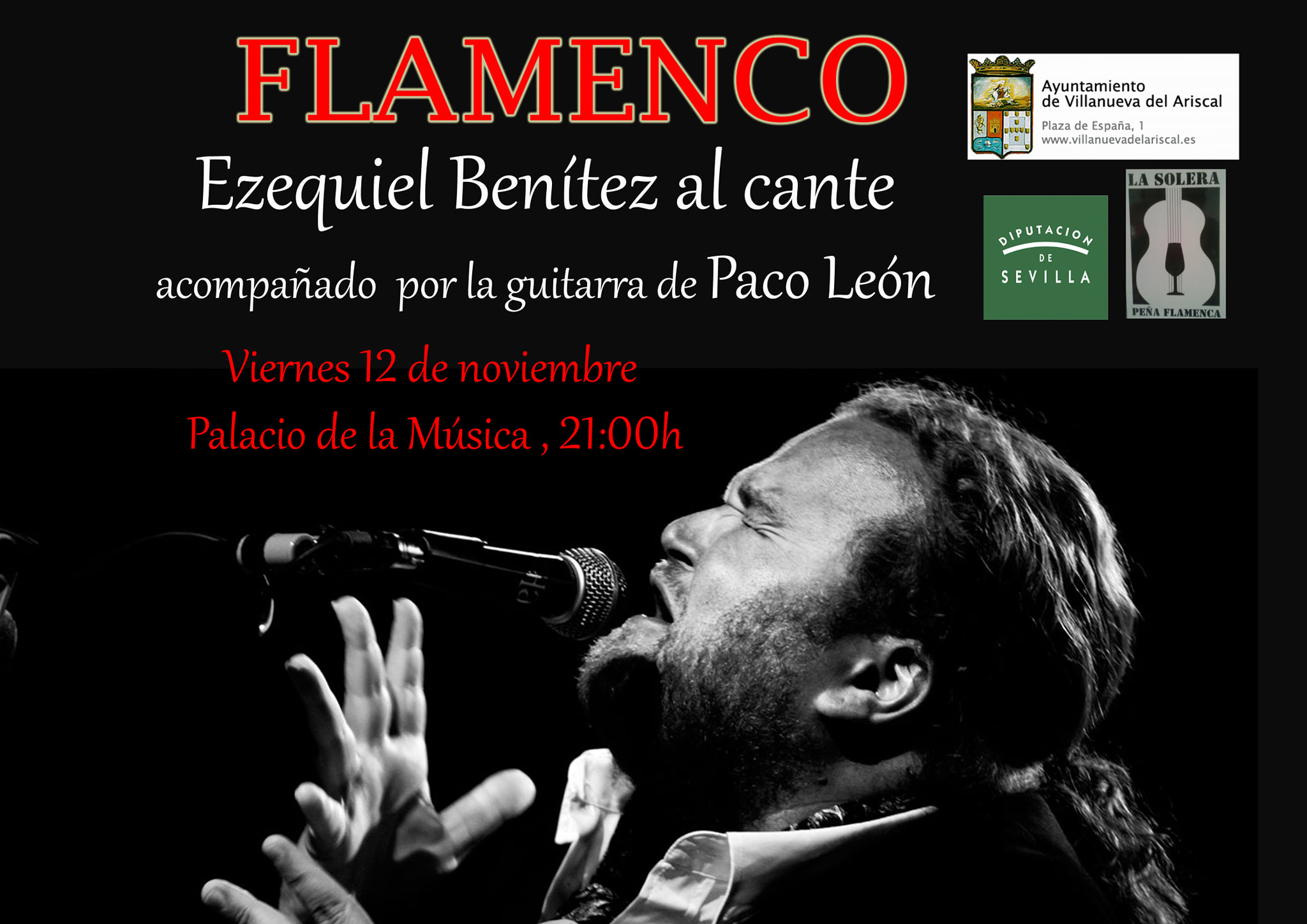 El viernes 12 de noviembre a las 21:00h en el Palacio de la Música, recital flamenco a cargo del cantaor Ezequiel Benítez que estará acompañado por la guitarra de Paco León. #VillanuevaDelAriscal #ElPuebloQueTúMereces #XVIIOtoñoCultural #FlamencoEzequielBenítez
