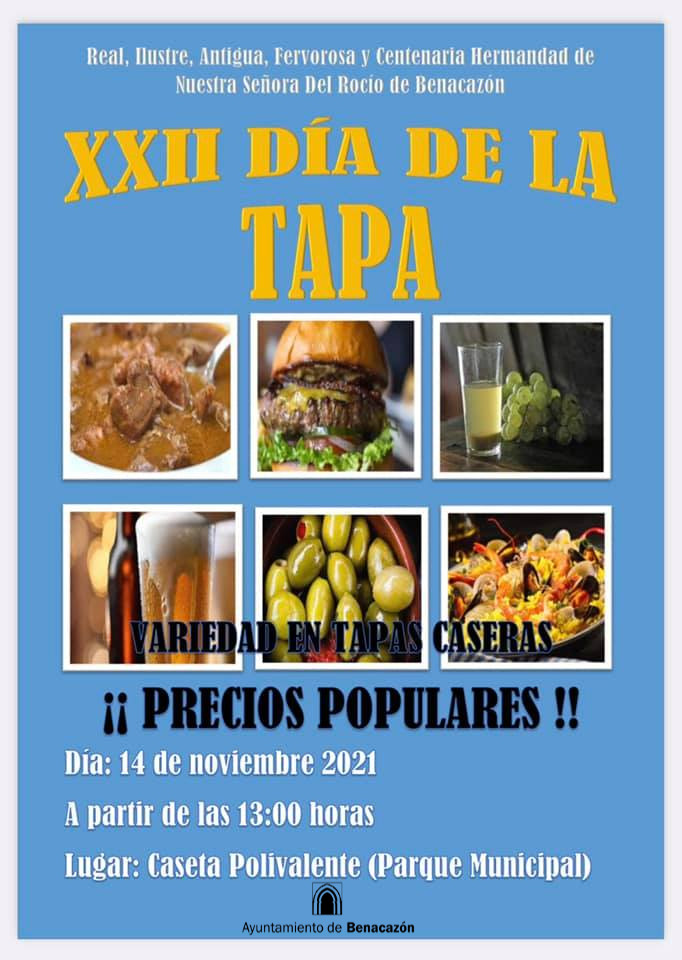 El Ayuntamiento de Benacazón informa sobre la celebración de la XXII edición del DÍA DE LA TAPA organizado por la Hermandad del Rocío de Benacazón, con la colaboración del Ayuntamiento, que tendrá lugar el próximo domingo 14 de Noviembre en la Caseta Polivalente del Parque Municipal.