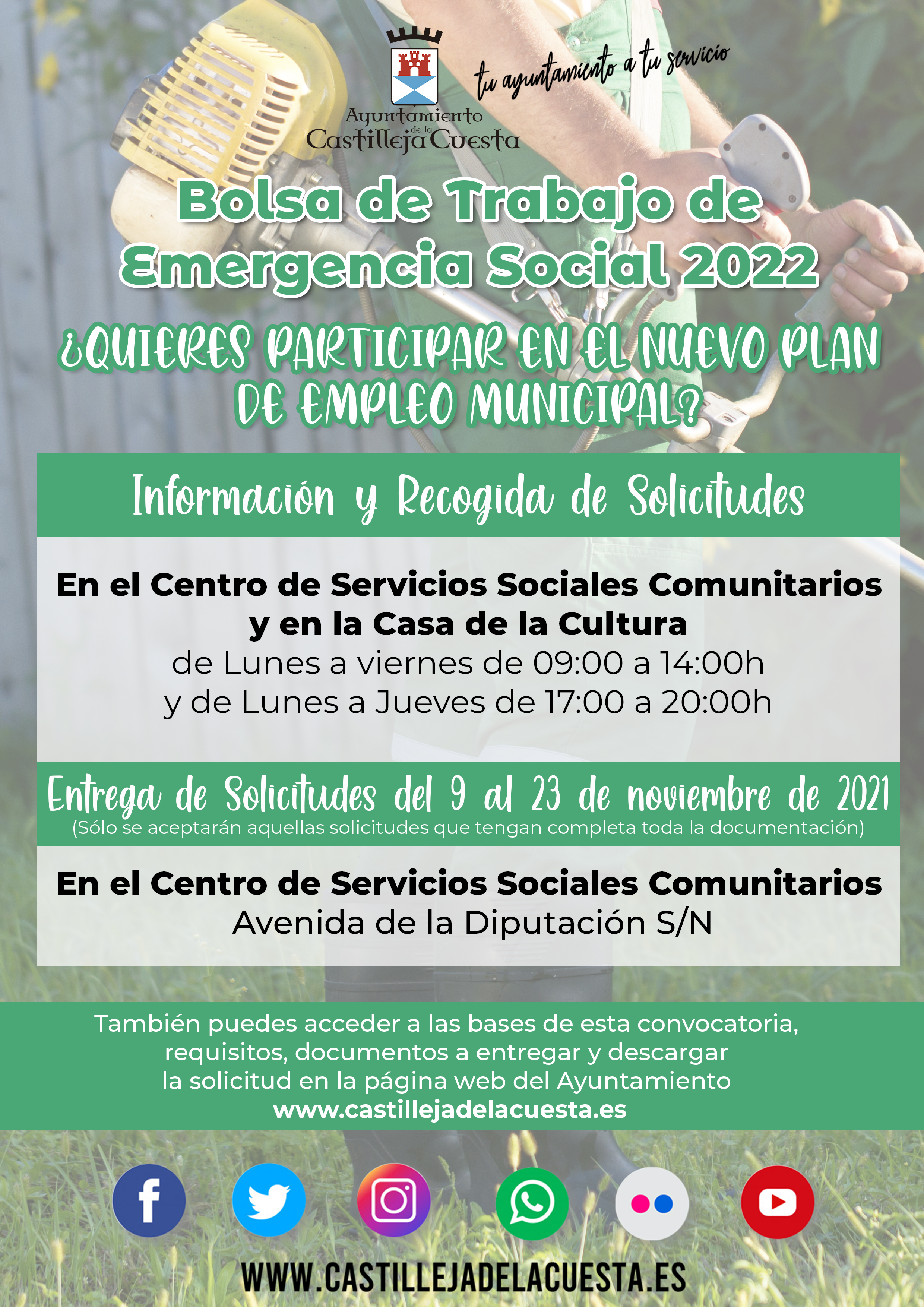 Pueden ampliar la información y recoger las solicitudes en la Delegación de Bienestar Social y en la Casa de la Cultura, de lunes a viernes en horario de 9:00 a 14:00h y de lunes a jueves en horario de 17:00 a 20:00h.