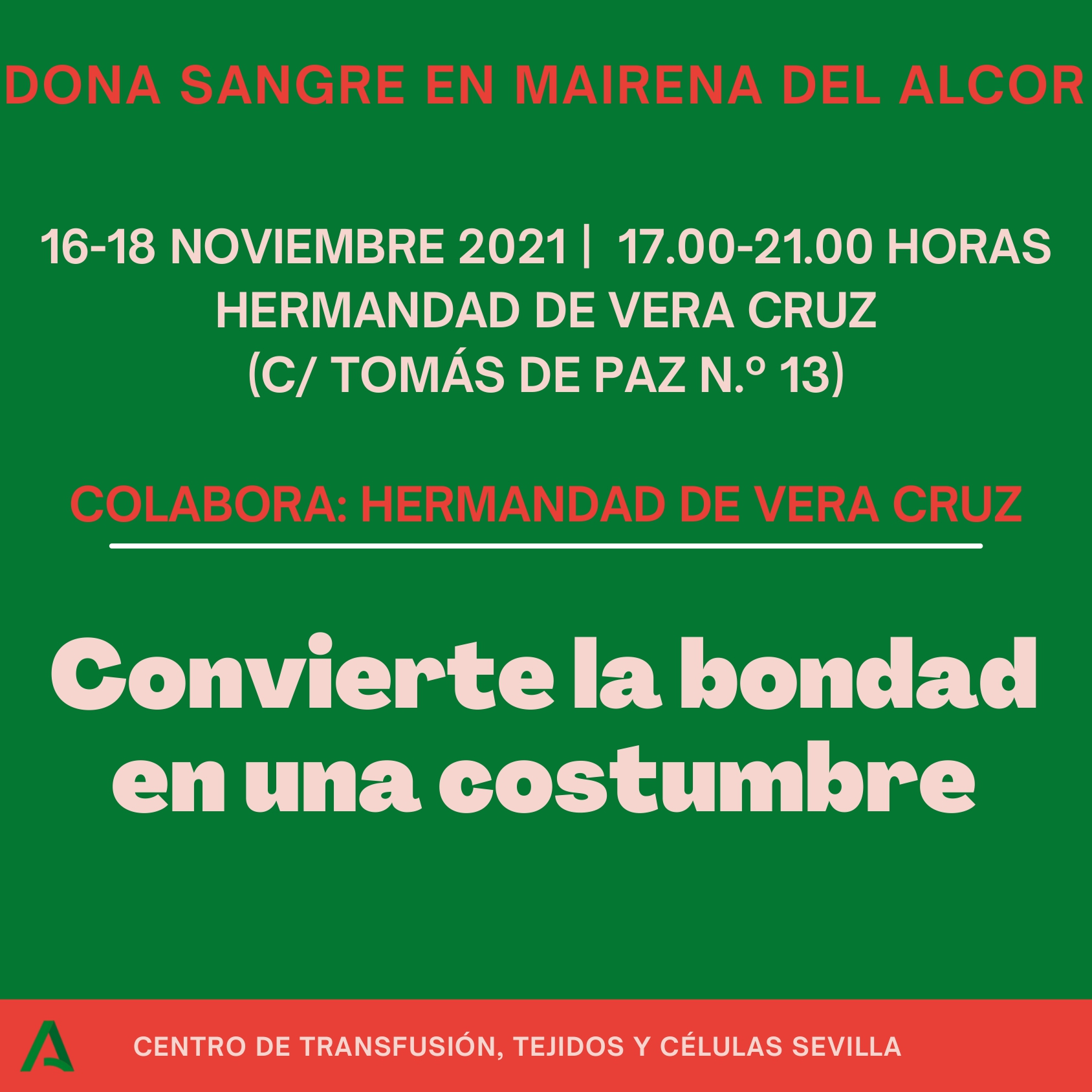 El Centro de Transfusión, Tejidos y Células de Sevilla organiza una nueva campaña de donación de sangre en la casa hermandad de la Vera Cruz (calle Tomás de Paz, 13) los días 16, 17 y 18 de noviembre de 17.00 a 21.00 horas.