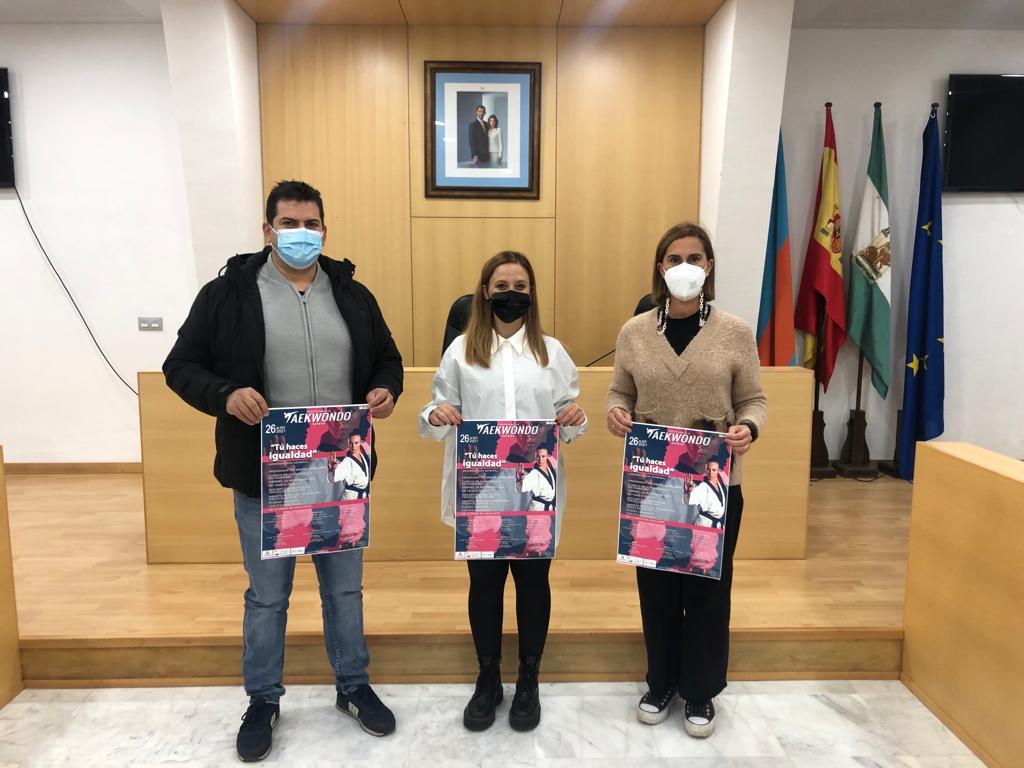 La delegada municipal de Deportes, Inmaculada Galocha, ha recibido al presidente de la Federación Andaluza de Taekwondo, Ismael Barnabal, y a la entrenadora de taekwondo Paula Acosta en el salón de plenos, donde ha tenido lugar la presentación del curso de autodefensa en femenino que se impartirá el viernes 26 de noviembre de 18.00 a 20.00 horas.