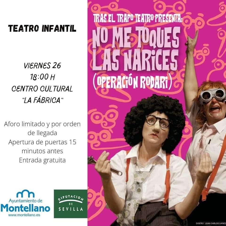 Este viernes, en el Centro Cultural "La Fábrica", nuevamente se representará una obra de teatro para público infantil "No me toques las narices (Operación Rodari)", a cargo de la compañía Tras el Trapo. ENTRADA GRATUITA. Aforo limitado por orden de llegada. Inicio a las 18:00 horas, apertura de puertas 15 minutos antes de la obra.