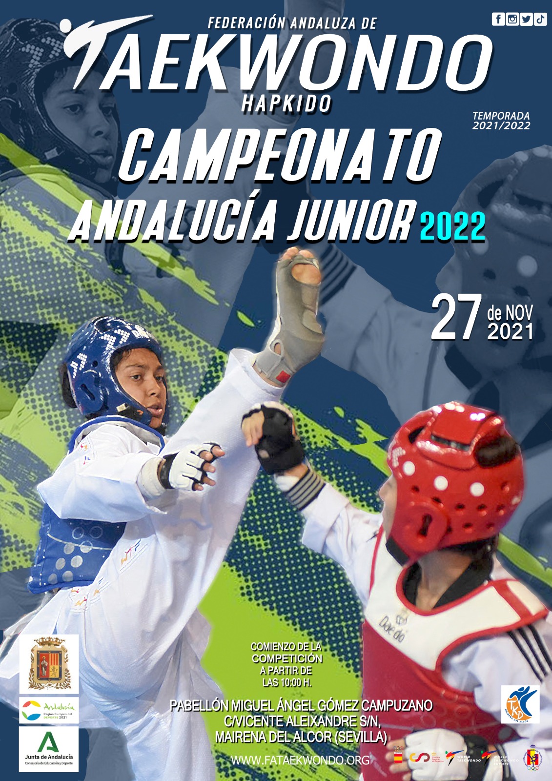 145 competidores procedentes de 45 clubes de toda Andalucía se darán cita este sábado en el Campeonato Andalucía Junior de Taekwondo. La competición comenzará a partir de las 10 horas en el Pabellón Miguel Ángel Gómez Campuzano.