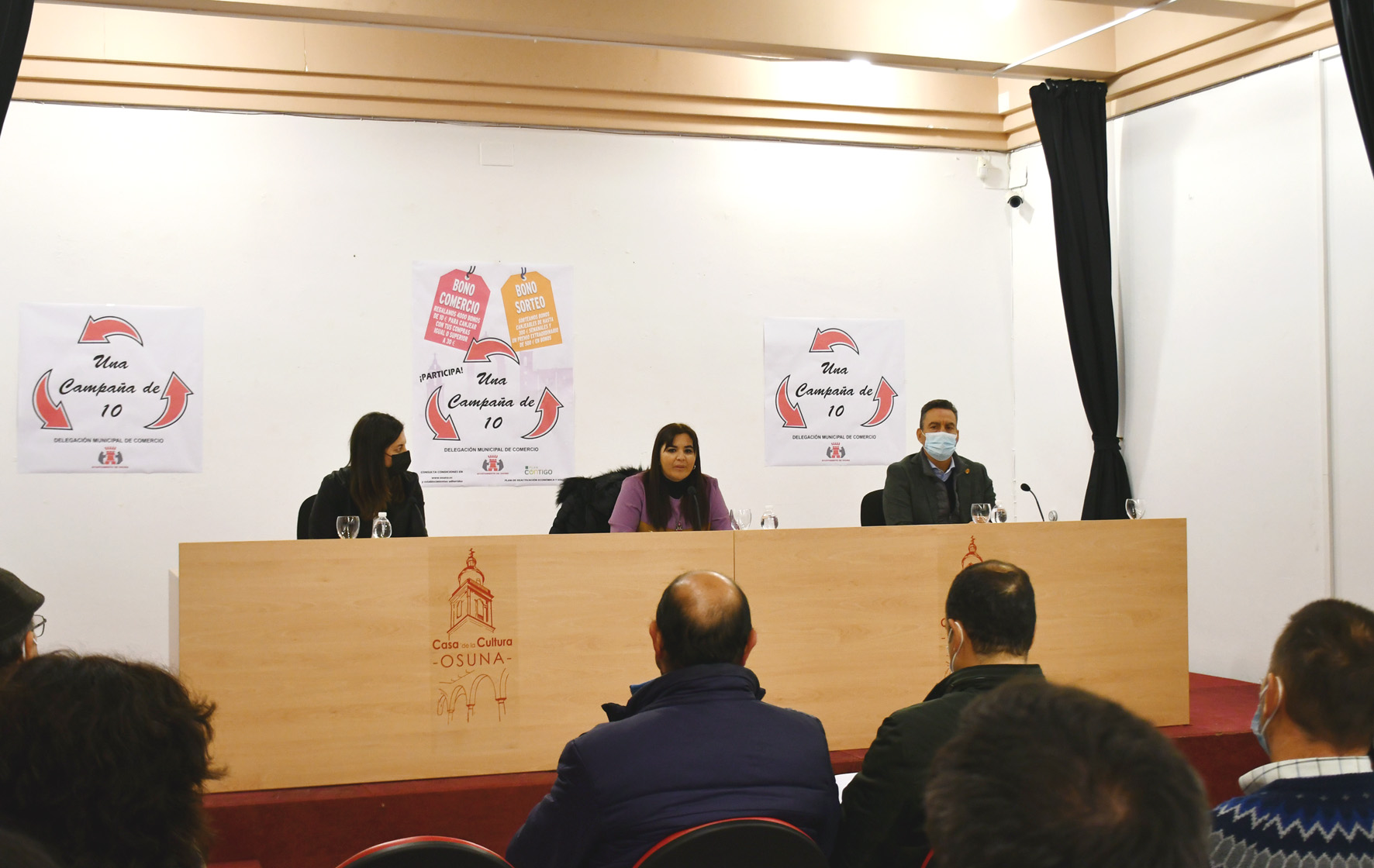 La delegada municipal de Actividades, Ana Lebrón, ha presentado a los comerciantes de Osuna "Una campaña de 10", una nueva iniciativa municipal para incentivar las compras y seguir apoyando y revitalizando el comercio local que se pondrá en marcha en este mes de diciembre para dar un mayor impulso al consumo y a las compras navideñas.