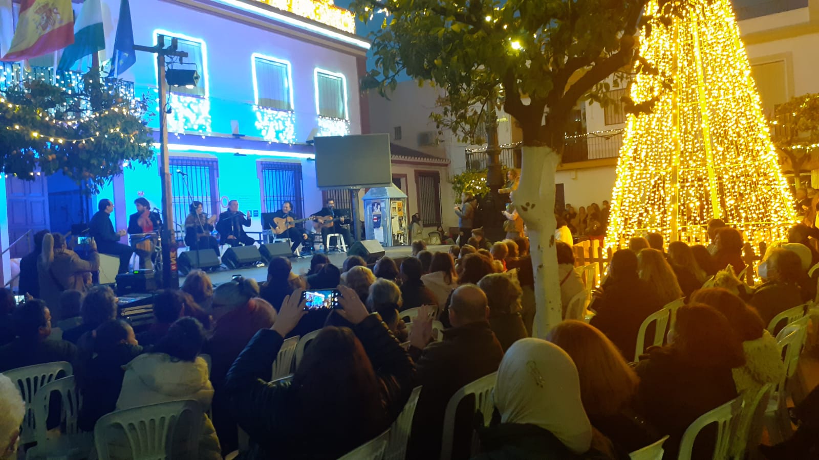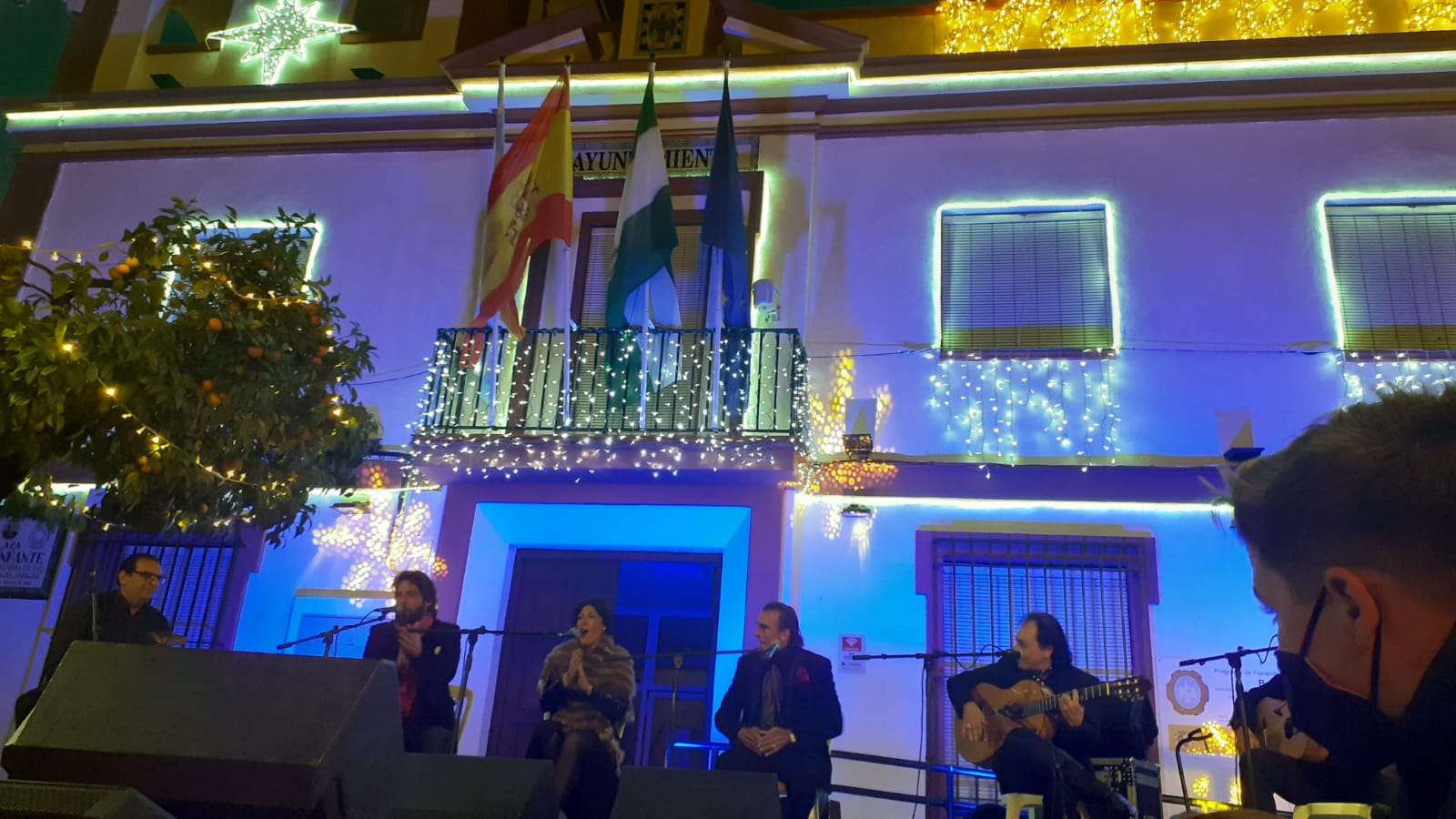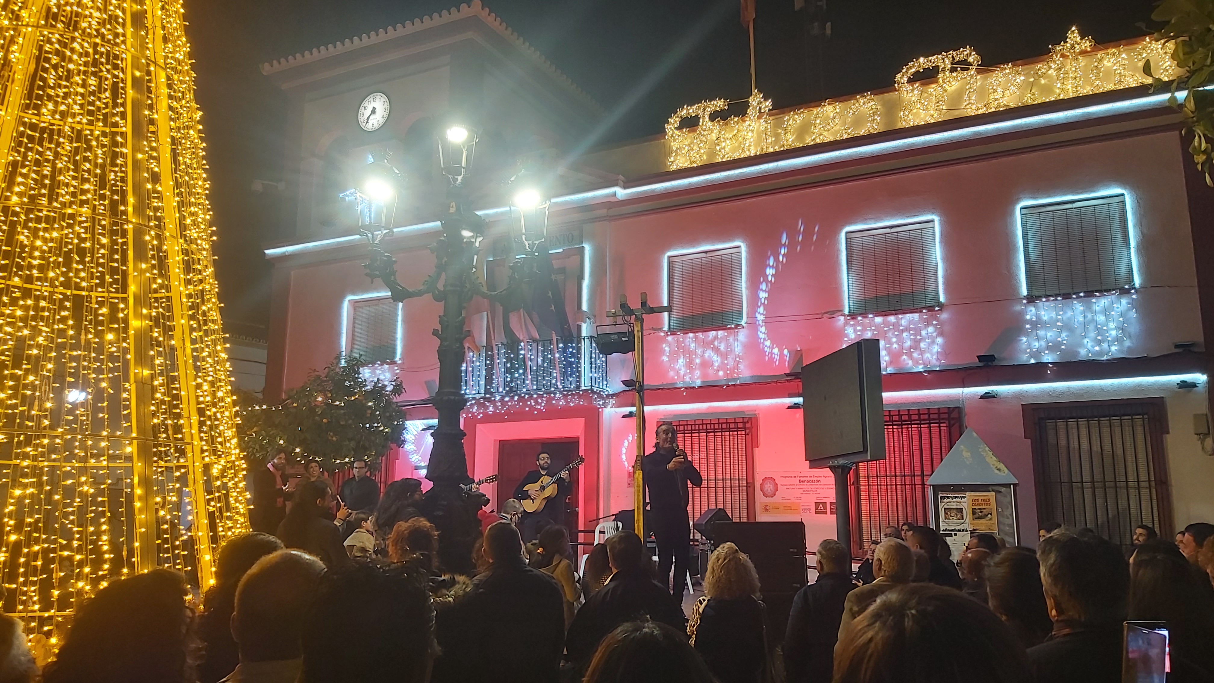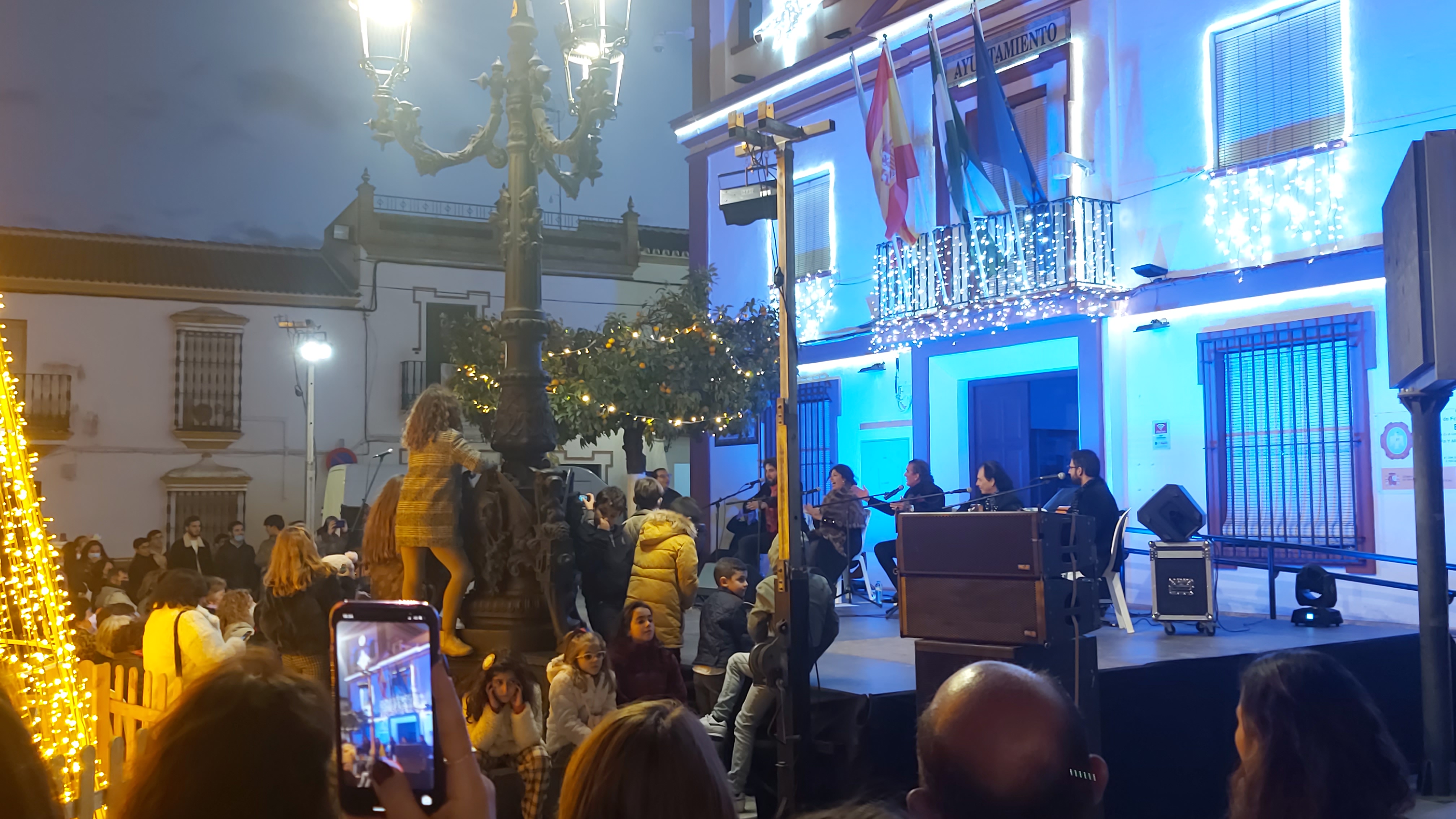 La plaza del ayuntamiento se llenó de un público bastante animado, en una tarde que sirvió como preámbulo de estas entrañables fiestas de Navidad, a través de un amplio repertorio de villancicos y temas flamencos interpretados por el conocido cantante Manuel Orta, acompañado de un gran elenco de músicos y artistas.