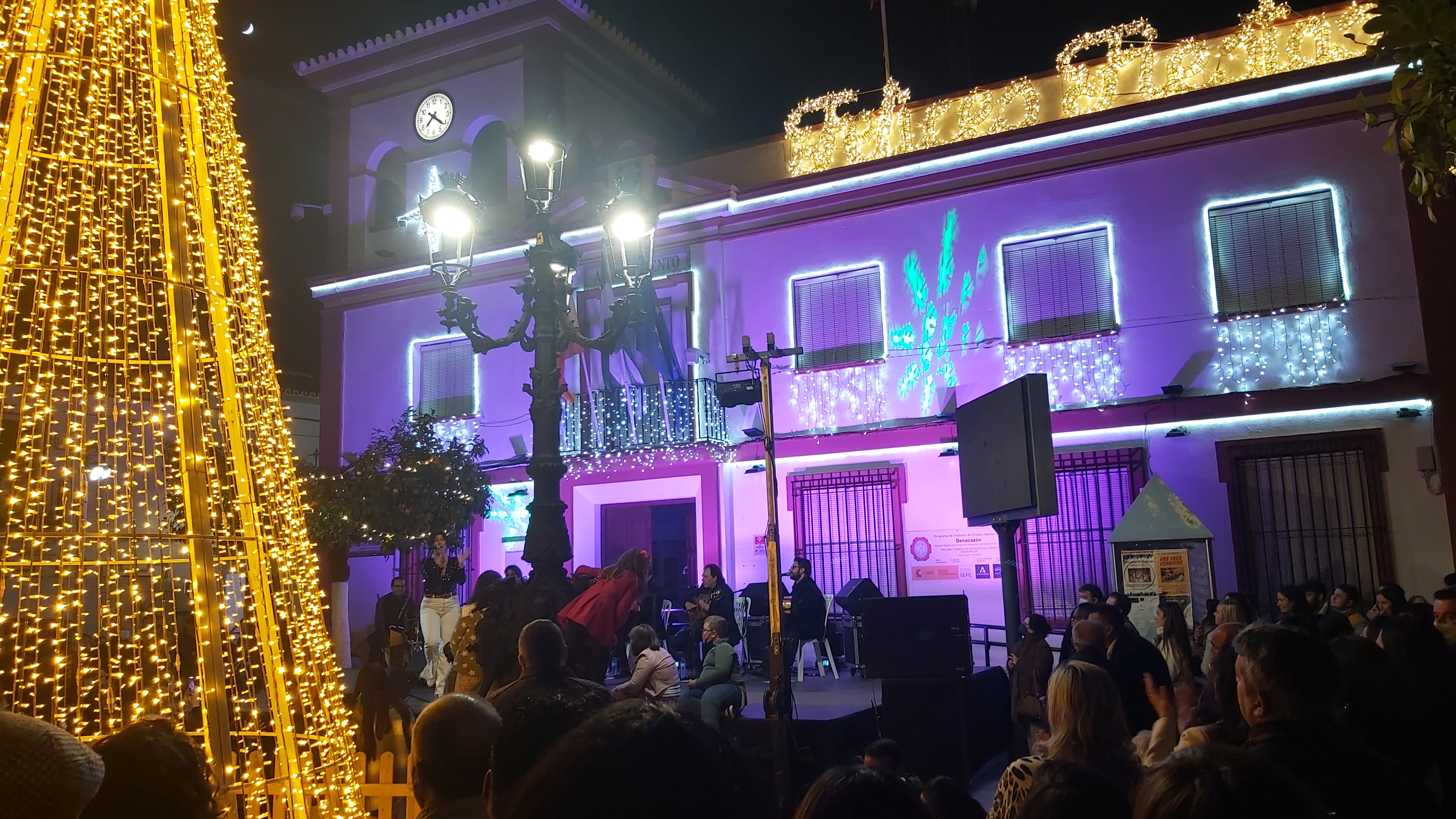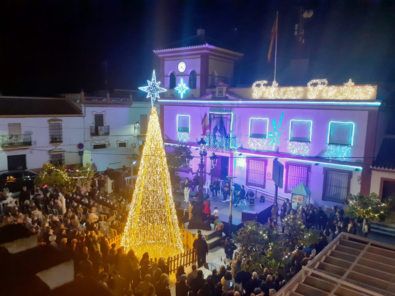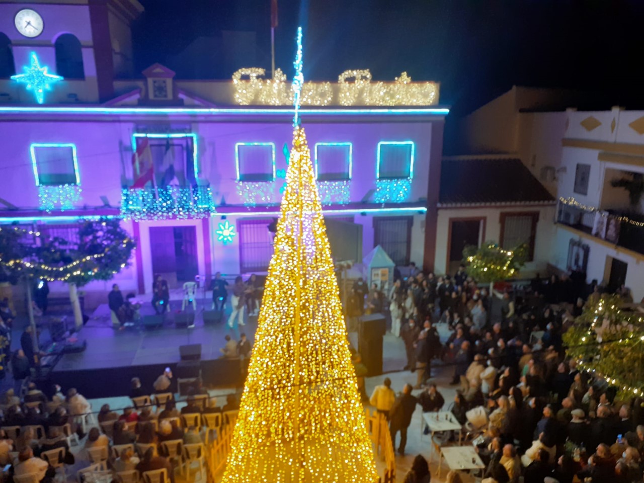 La plaza del ayuntamiento se llenó de un público bastante animado, en una tarde que sirvió como preámbulo de estas entrañables fiestas de Navidad, a través de un amplio repertorio de villancicos y temas flamencos interpretados por el conocido cantante Manuel Orta, acompañado de un gran elenco de músicos y artistas.