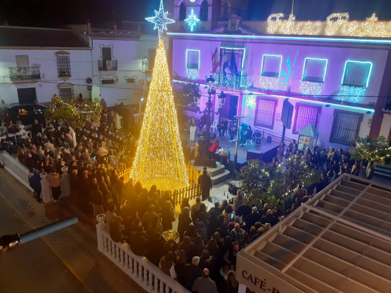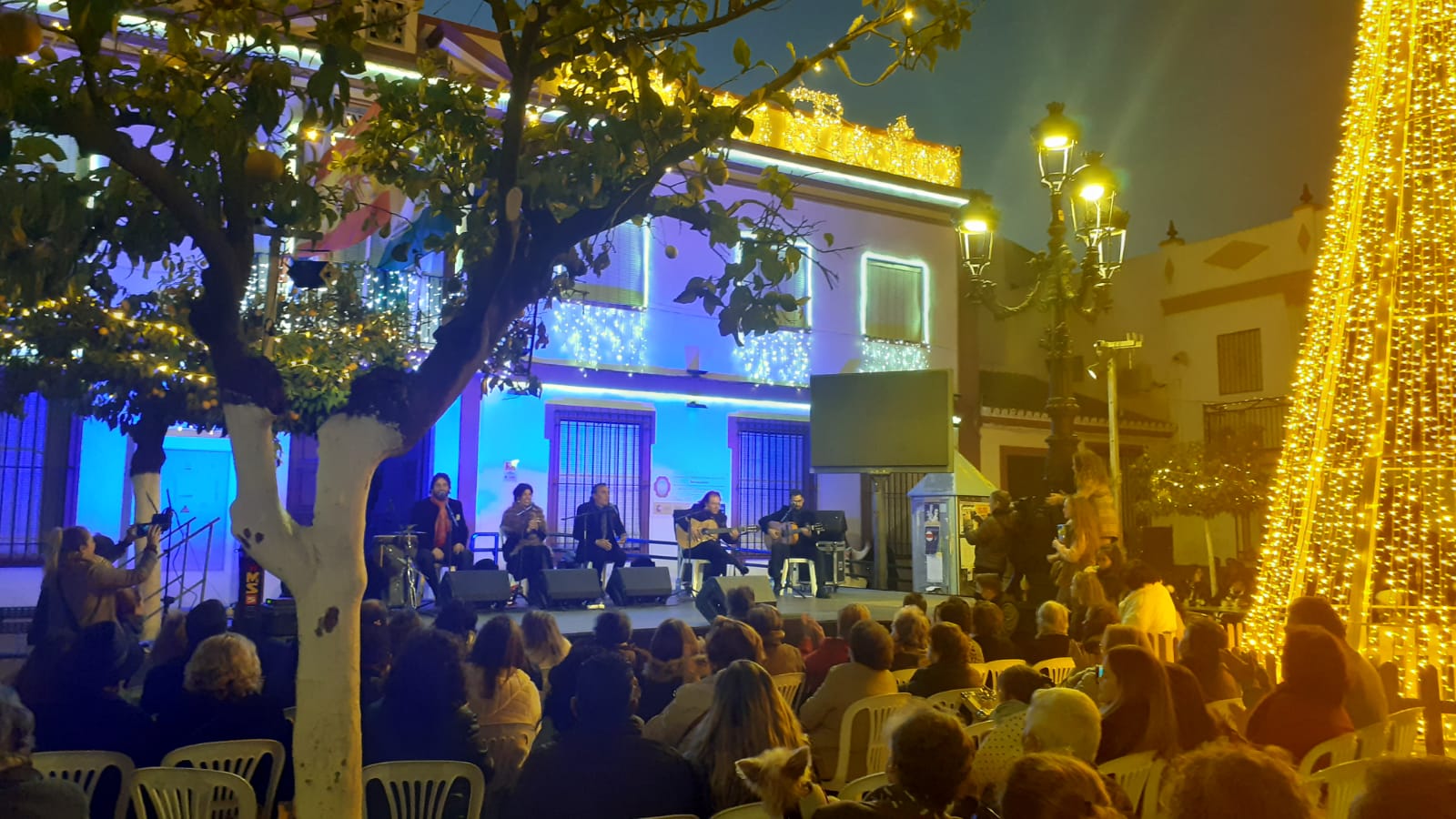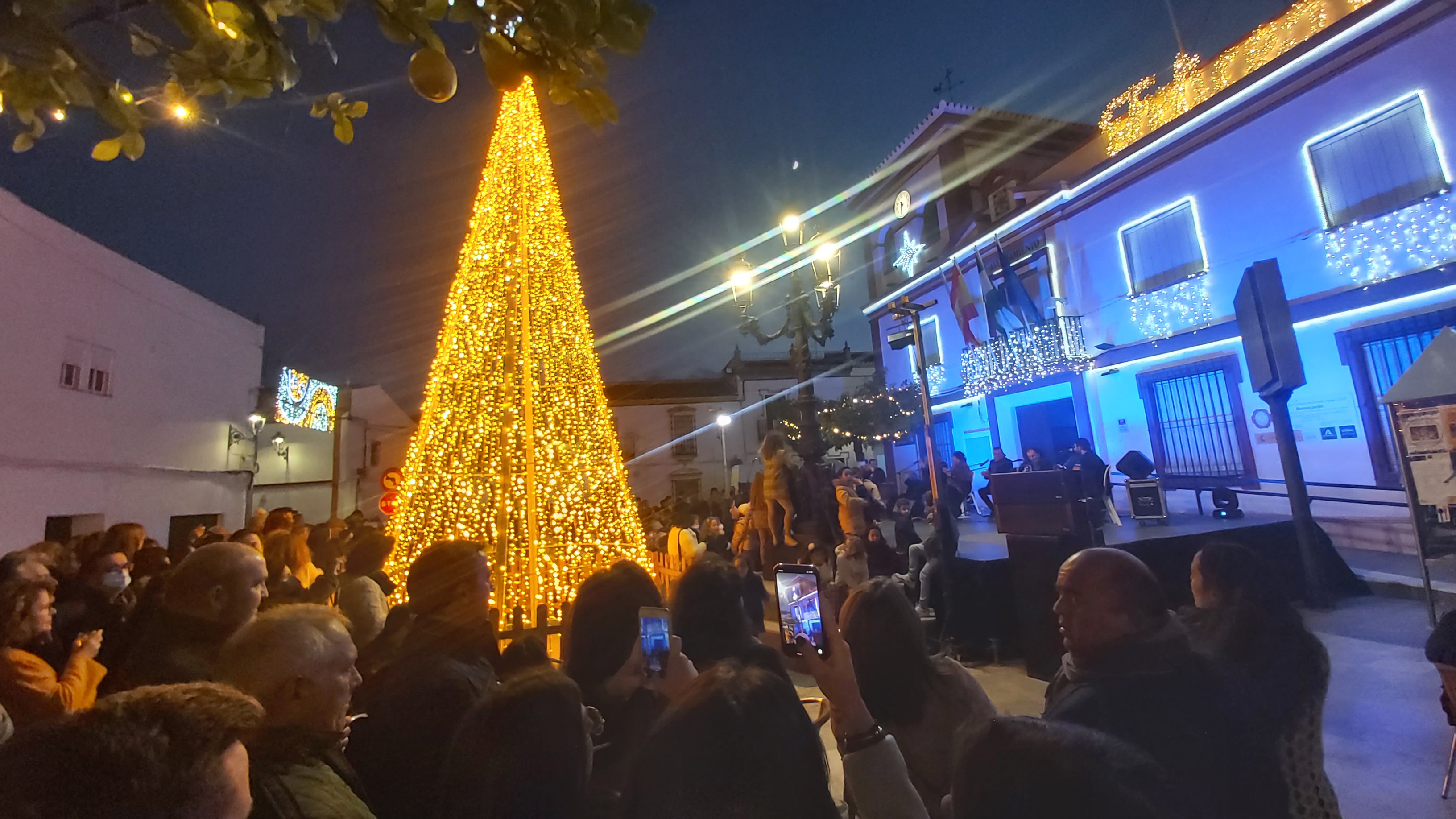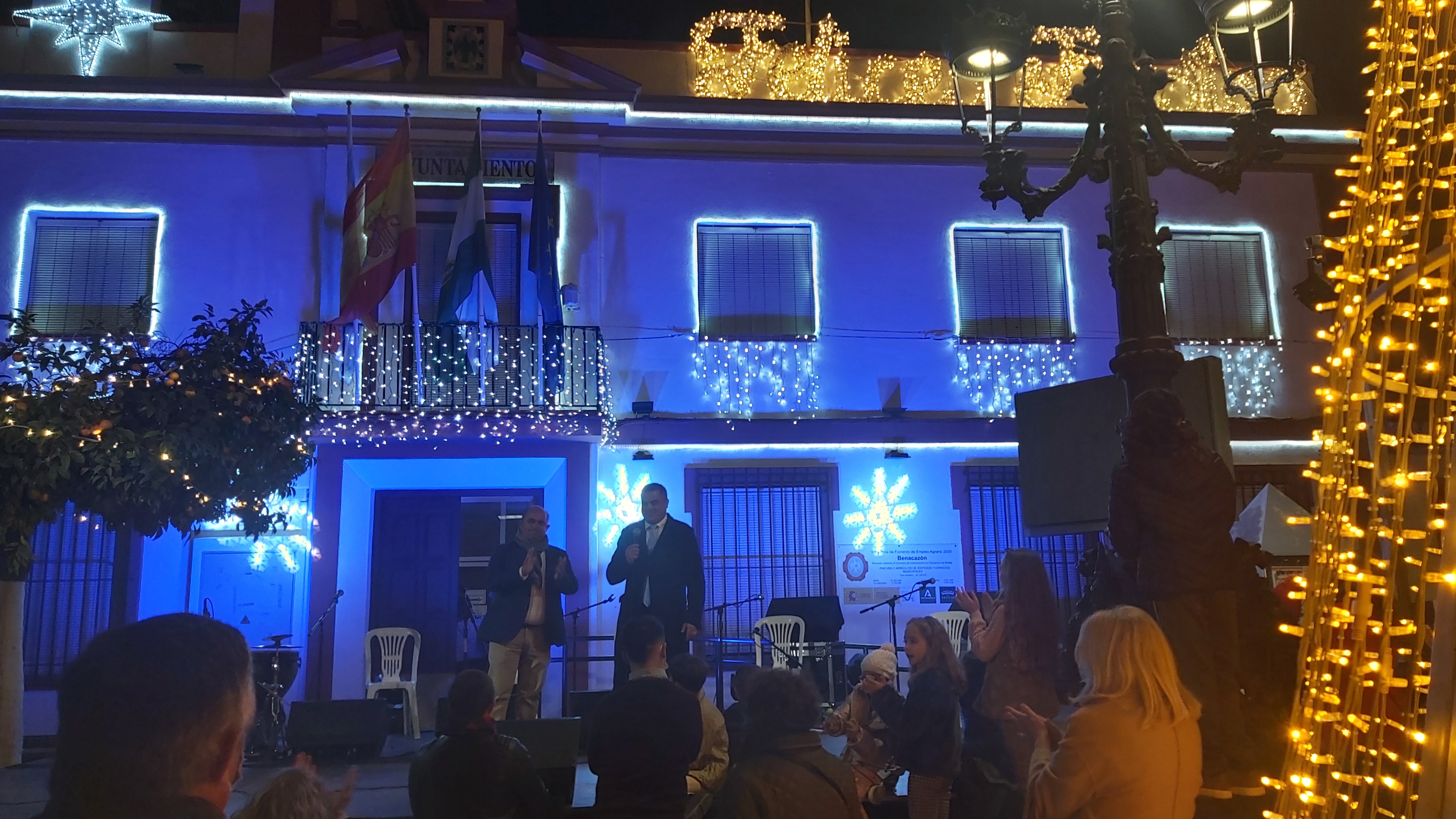 La plaza del ayuntamiento se llenó de un público bastante animado, en una tarde que sirvió como preámbulo de estas entrañables fiestas de Navidad, a través de un amplio repertorio de villancicos y temas flamencos interpretados por el conocido cantante Manuel Orta, acompañado de un gran elenco de músicos y artistas.
