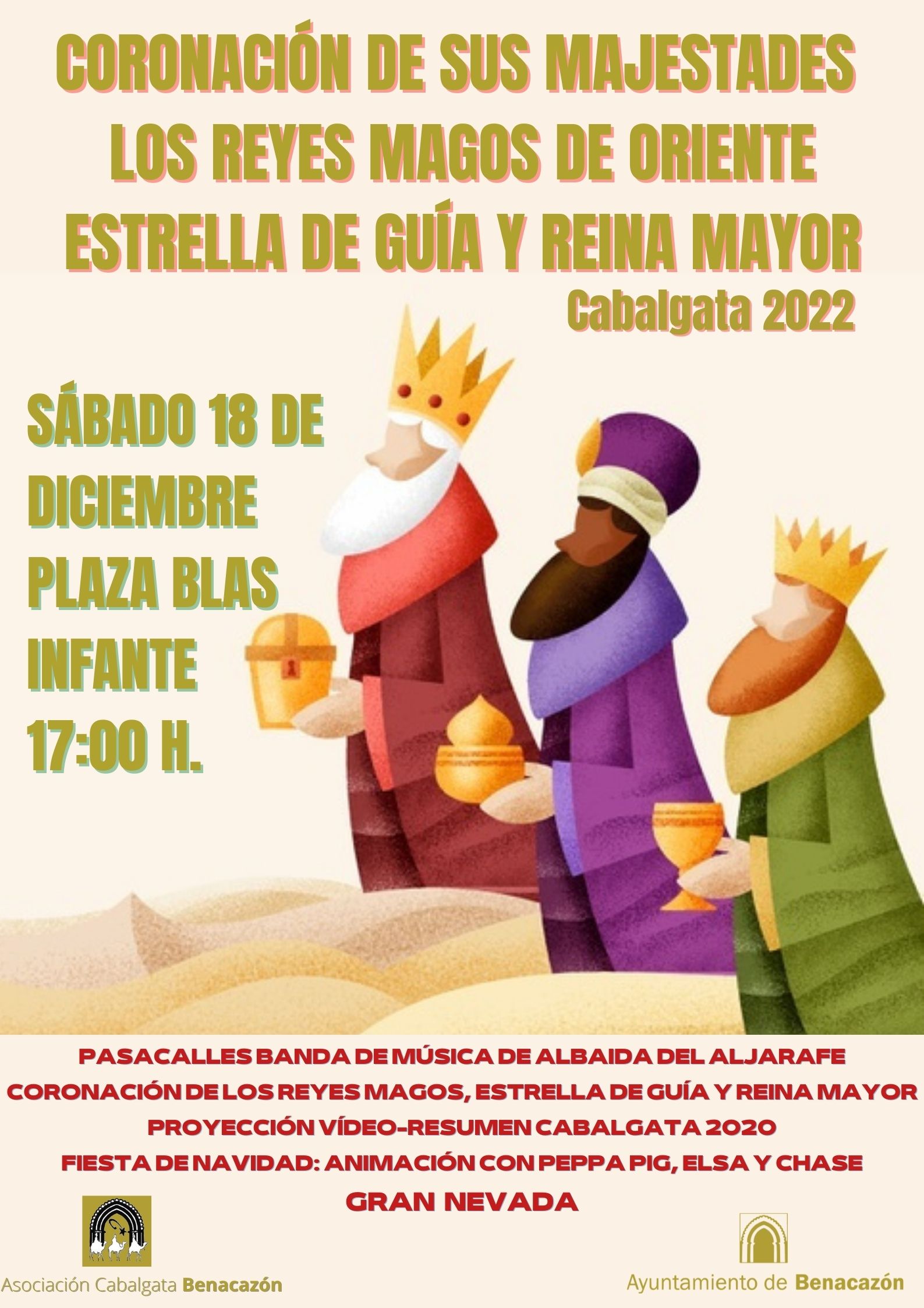 - Rey Melchor.- SERGIO GALLARDO RUIZ - Rey Gaspar.- JOSÉ VERA OLIVARES - Rey Baltasar.- DAVID ROJAS SANTANA - Estrella de Guía.- RAQUEL SANTANA CARNERERO - Reina Mayor.- ROCÍO MARCELO GARCÍA Abrirá el acto un Pasacalles de la Banda de Música de Albaida del Aljarafe, que acompañará al Cortejo desde la Casa Palacio hasta la Plaza Blas Infante, donde los protagonistas salientes de la última Cabalgata (celebrada en 2020) coronarán a los actuales Reyes Magos, Estrella de Guía y Reina Mayor de la CABALGATA DE REYES MAGOS de Benacazón 2022, que tendrá lugar el próximo 5 de Enero. A continuación se proyectará un VÍDEO-RESUMEN de la CABALGATA de 2020 y seguidamente FIESTA INFANTIL DE NAVIDAD que contará con los personajes: PEPPA PIG, ELSA Y CHASE. CERRARÁ EL ACTO UNA GRAN NEVADA!! Desde tu Ayuntamiento esperamos que todos nuestros vecinos y visitantes -que se acercan estos días hasta nuestra localidad- se animen a participar, acompañados por familiares y amigos, de esta actividad y toda la amplia programación que compone la campaña "VIVE LA NAVIDAD EN BENACAZÓN 2021". Asimismo, transmitimos el mensaje de que seamos responsables durante estos días y continuemos respetando las medidas de higiene y protección frente al Covid tales como el uso obligatorio de mascarilla en espacios públicos y cerrados, así como en espacios abiertos cuando no sea posible mantener la debida distancia de seguridad.Imágenes