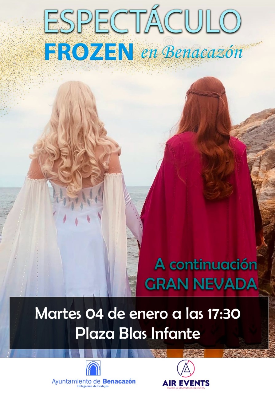 El Ayuntamiento de Benacazón informa que el espectáculo infantil "FROZEN" y "Gran Nevada", que estaban previstos en la Programación de Navidad para el 23 de Diciembre y que fue aplazado por la previsión meteorológica de lluvias, tendrá lugar el 4 de Enero de 2022, a las 17:30 horas en la Plaza Blas Infante.