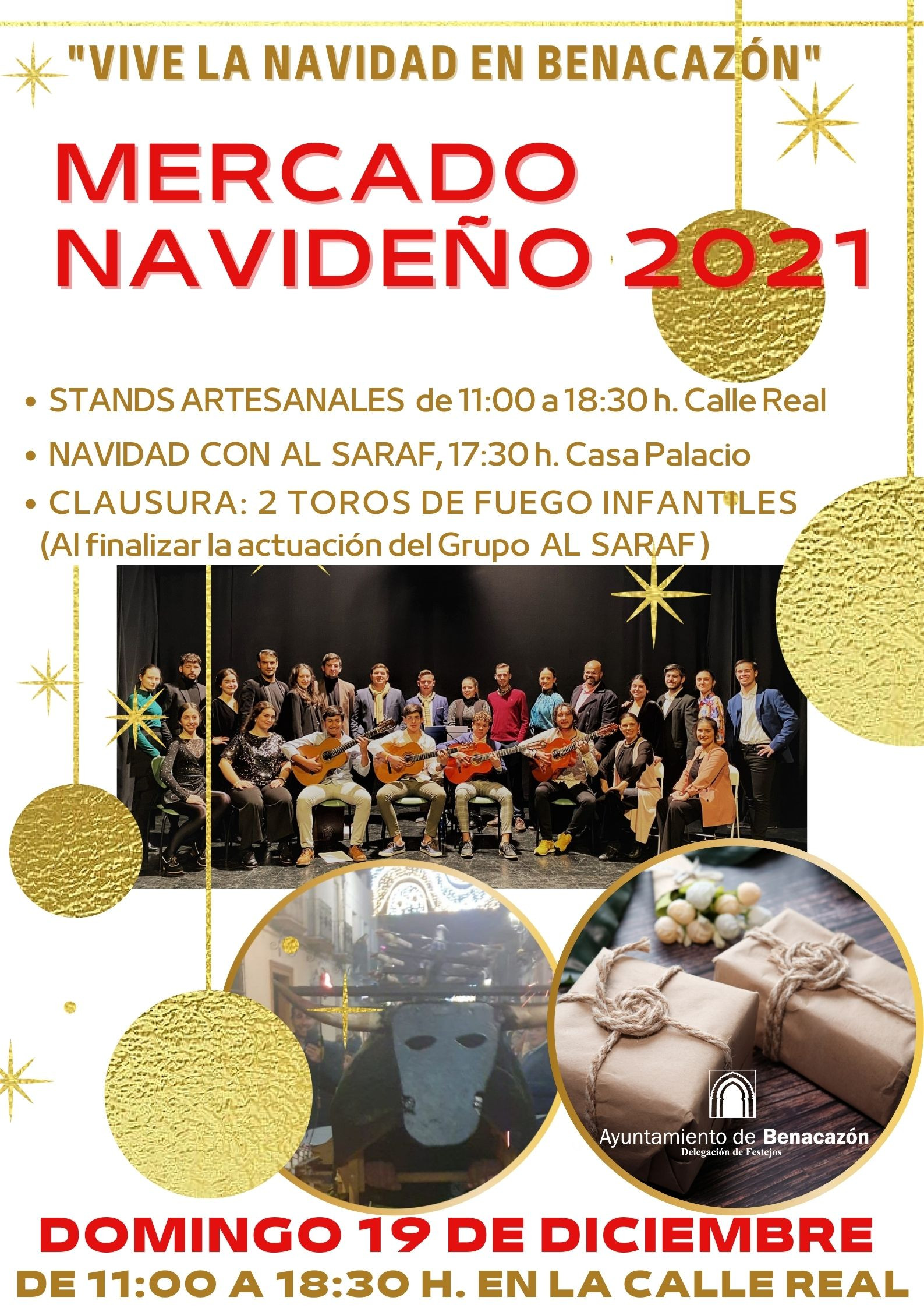 Para amenizar el mercado navideño, ya por la tarde pudimos disfrutar de la gran actuación "NAVIDAD CON AL SARAF" a las 17:30 horas en el Patio de la Casa Palacio. Al finalizar el Grupo Al Saraf, se quemaron 2 Toros de Fuego Infantiles, tan característicos de Benacazón, que clausuraron el Mercado Navideño 2021.