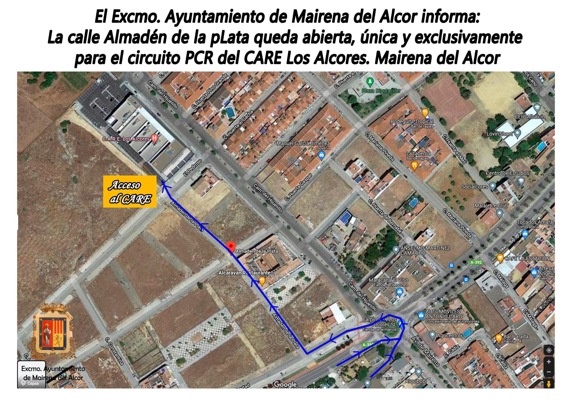El Ayuntamiento de Mairena del Alcor informa que la calle Almadén de la Plata que abierta, única y exclusivamente, para el circuito PCR del CARE Los Alcores. Mairena del Alcor.
