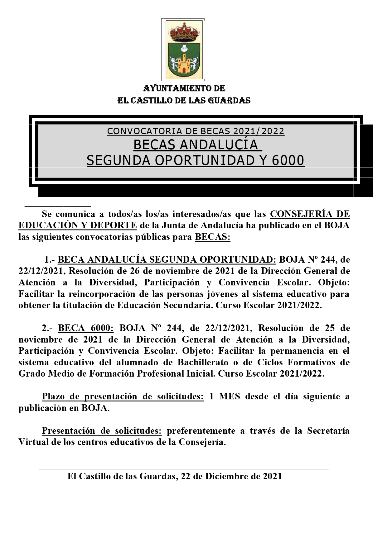 1.- BECA ANDALUCÍA SEGUNDA OPORTUNIDAD: Objeto:Facilitar la reincorporación de las personas jóvenes al sistema educativo para obtener la titulación de Educación Secundaria. Curso Escolar 2021/2022.