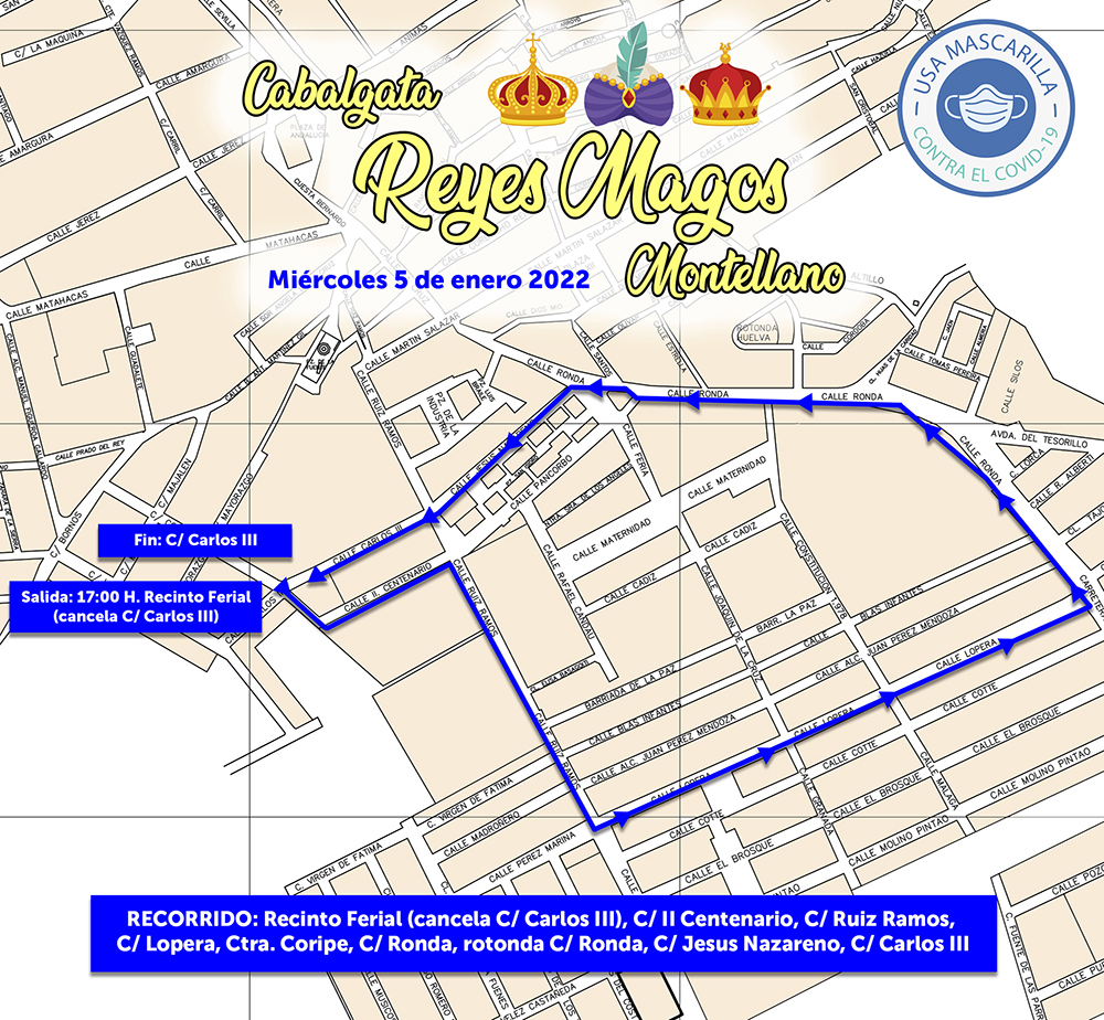 17:00 H. Cabalgata de Reyes Magos. RECORRIDO: Recinto Ferial (cancela C/ Carlos III), C/ II Centenario, C/ Ruiz Ramos, C/ Lopera, Ctra. Coripe, C/ Ronda, rotonda C/ Ronda, C/ Jesús Nazareno y final en C/ Carlos III