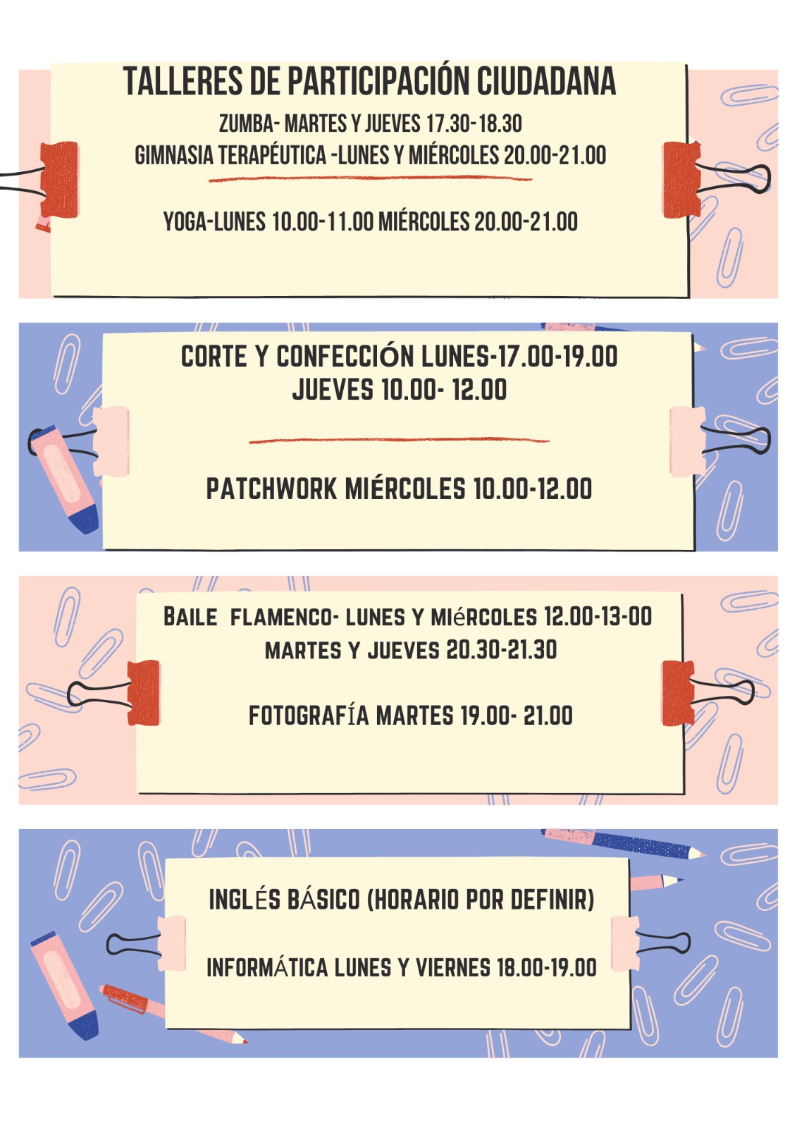 - Inglés básico: horario por definir.