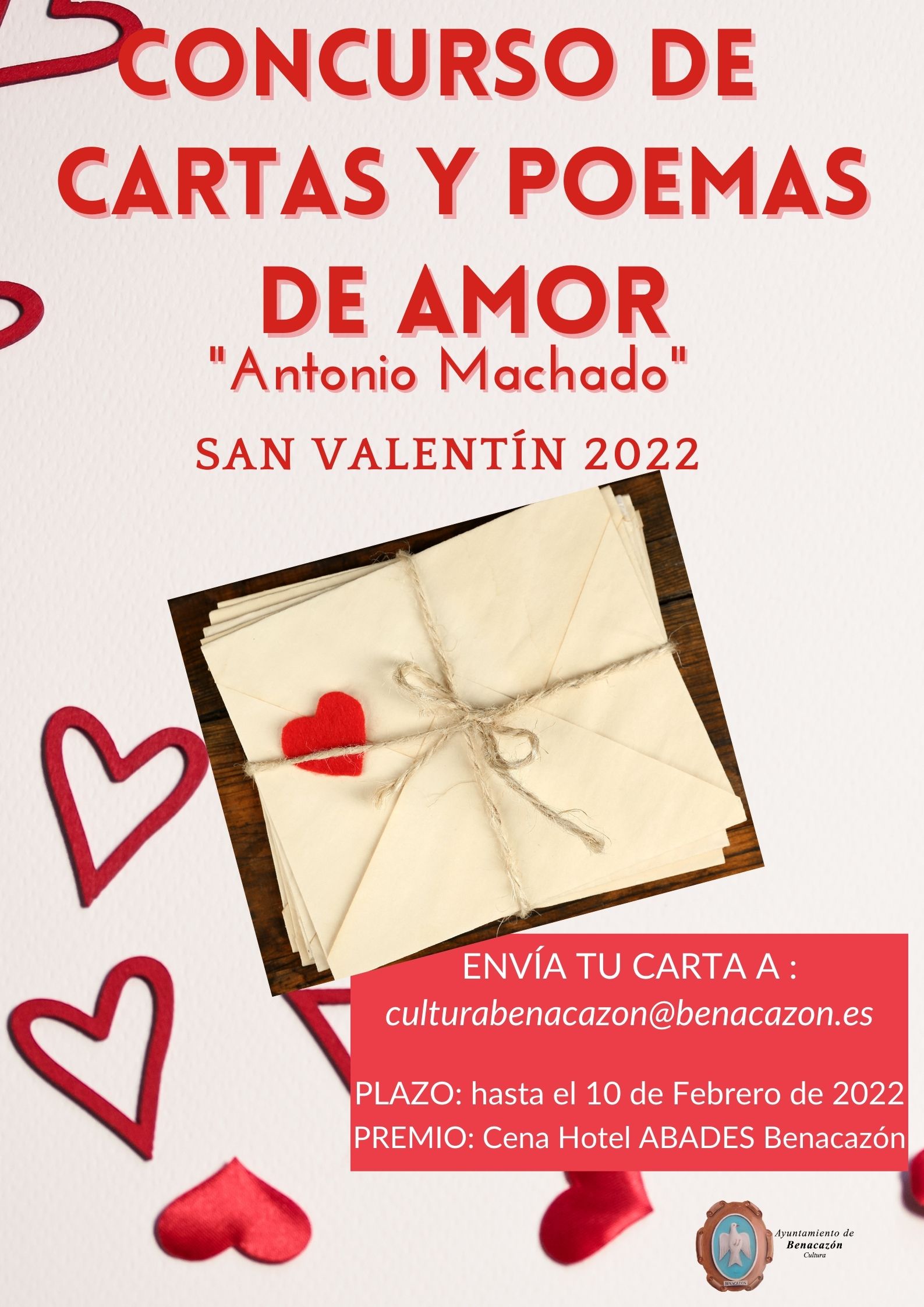 El Ayuntamiento de Benacazón informa sobre la convocatoria del tradicional Concurso de Cartas y Poemas de Amor "Antonio Machado", una actividad que se celebra desde hace 18 años en nuestro pueblo con motivo del 14 febrero, Día de los Enamorados.