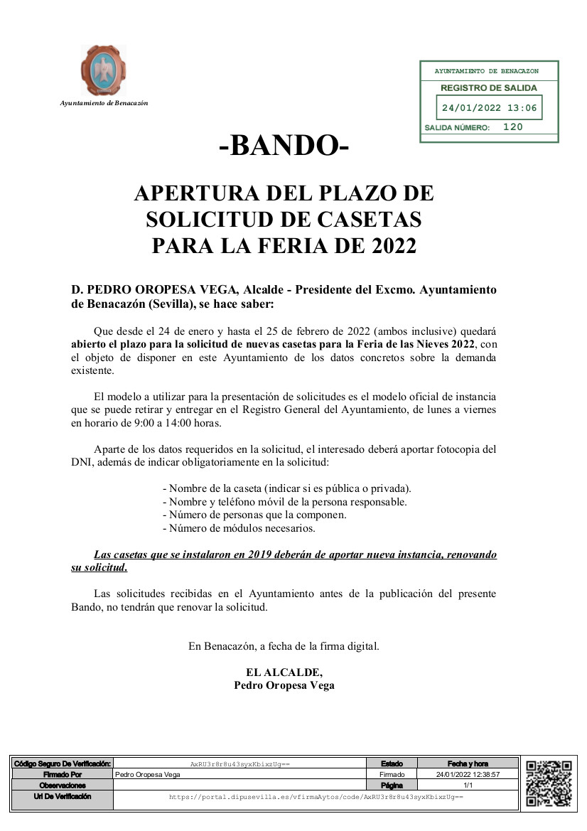 El Ayuntamiento de Benacazón informa que, desde el 24 de Enero y hasta el 25 de Febrero de 2022 (ambos inclusive) quedará abierto el plazo para la Solicitud de nuevas casetas para la Feria de Las Nieves 2022, con el objeto de disponer en este Ayuntamiento de los datos concretos sobre la demanda existente.