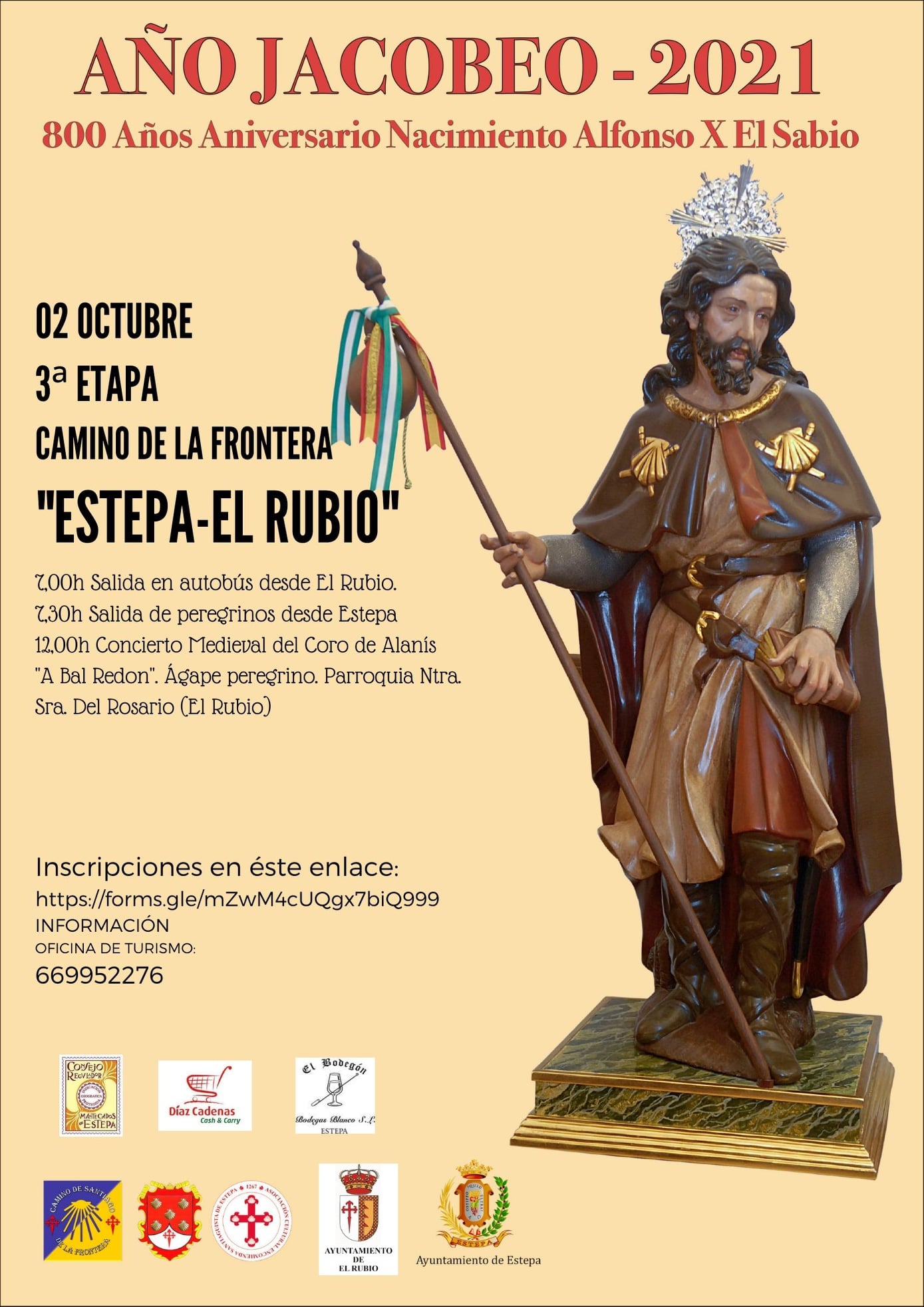 #caminodesantiago #Xacobeo2021 #ordendesantiagoestepa ABIERTO PLAZO DE INSCRIPCIÓN 3ª ETAPA "ESTEPA-EL RUBIO" ¿Quieres participar en la 3ª Etapa del Camino de la Frontera entre Estepa-El Rubio? En esta tercera ruta saldremos a las 7:30 de la mañana de la iglesia de Ntra. Sra. de los Remedios. A la llegada, disfrutaremos del concierto medieval del coro de Alanís "A Bal Redon" en la parroquia Ntra. Sra. del Rosario de El Rubio y finalizaremos con un ágape de confraternización. Se dispondrá de un servicio de traslado de peregrinos en autobús que saldrá a las 7:00 de la mañana de la parada de autobuses de El Rubio e igualmente este servicio trasladará a los asistentes de Estepa inscritos una vez finalizados los actos. Solo tienes que inscribirte a través de éste enlace https://forms.gle/mZwM4cUQgx7biQ999 El plazo terminará el 27 de septiembre (aforo limitado). INFO: OFICINA DE TURISMO (ESTEPA) 669 952 276 Disfruta del Camino de la Frontera, Estepa-El Rubio. AÑO JACOBEO 2021 "800 Años Aniversario Alfonso X El Sabio"