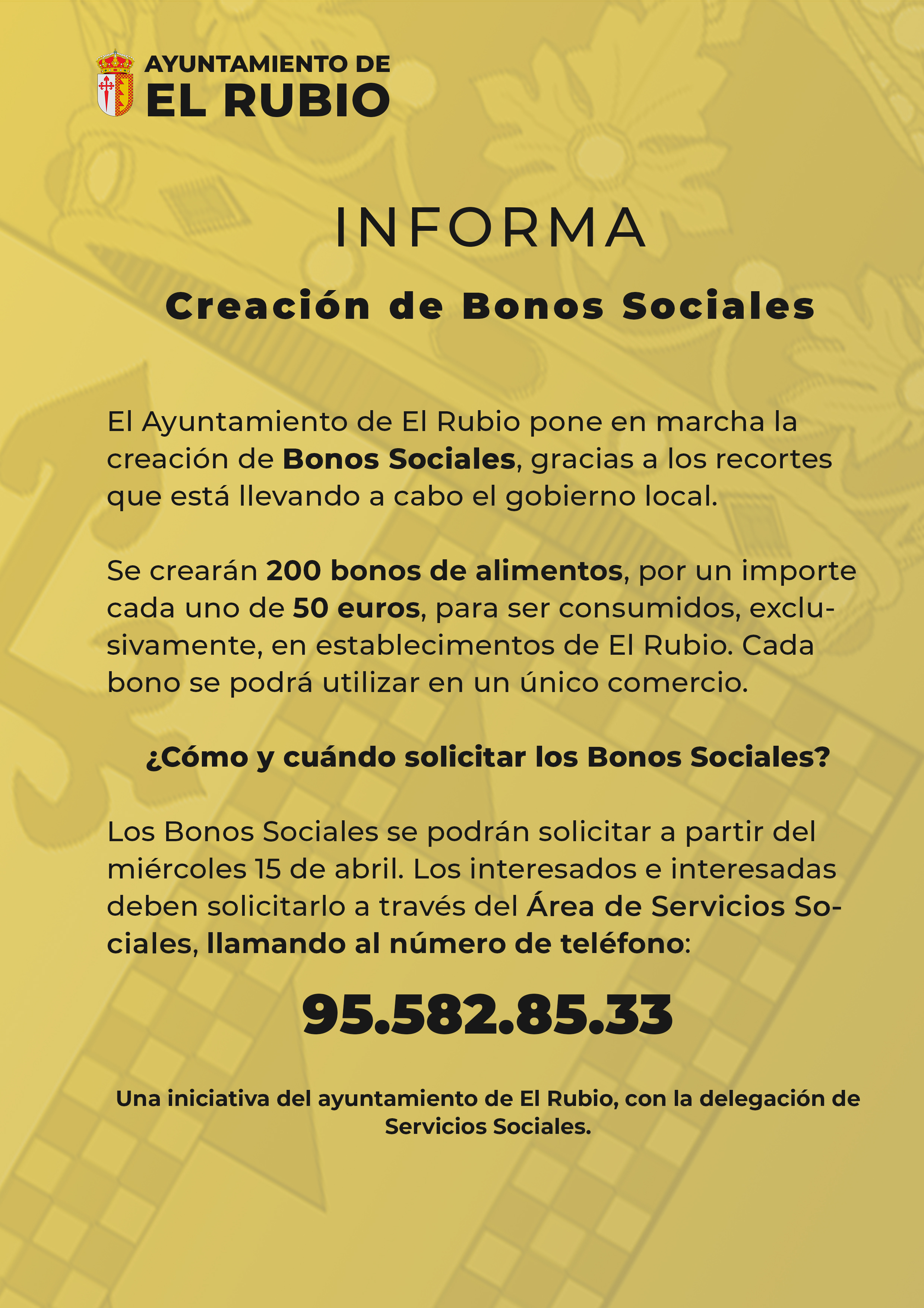 Imagen Ubicación Categoría noticia Comunicación Mostrar en el carrusel de la sección No Fecha Vie, 17/04/2020 - 11:33 Más información http://www.elrubio.es/es/actualidad/noticias/BONOS-SOCIALES-DEL-AYUNTAMIENTO-DE…