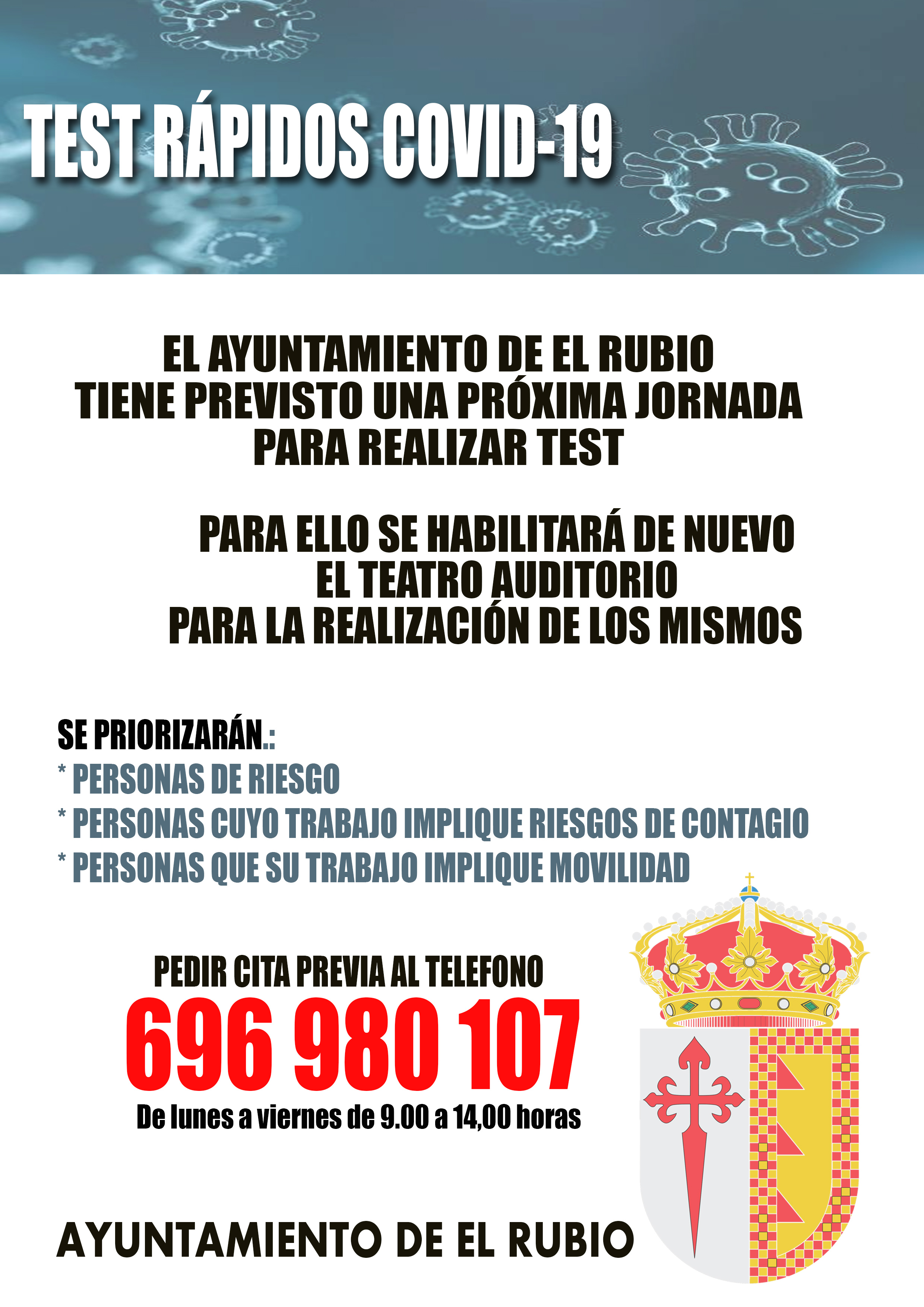 El ayuntamiento de El Rubio informa a todos los interesados e interesadas del municipio en realizarse el test rápido de la COVID-19, que tras la finalización de las tandas llevadas a cabo durante las semanas anteriores, se prevé una próxima jornada de pruebas. Para ello se volverá a habilitar el teatro auditorio cumpliendo todas las medidas sanitarias.