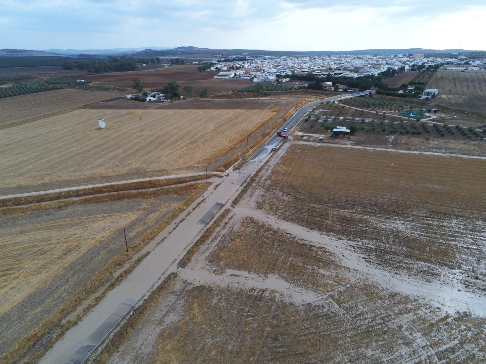 Foto aérea de la carretera de El Rubio a Marinaleda, SE-720, después de las fuertes lluvias. Foto cedida por Héctor González Barea.