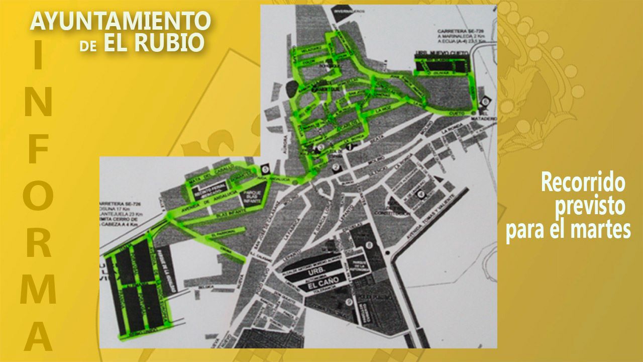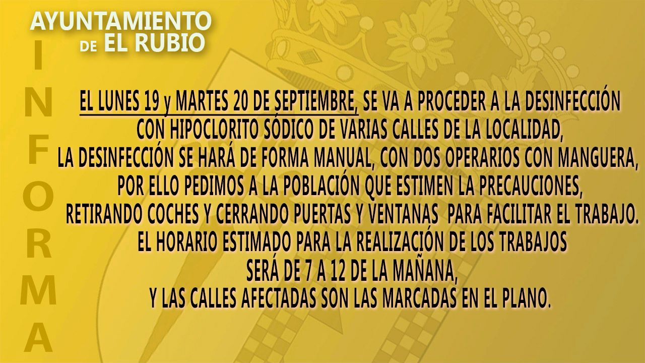 El Ayuntamiento de El Rubio informa que el próximo lunes 19 y martes 20 de octubre se procederá a la desinfección de las calles del municipio de forma manual con hipoclorito sódico. El horario estimado será de 7 a 12 de la mañana y las calles afectadas serán las marcadas en los planos adjuntos