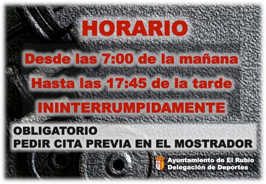 El GIMNASIO MUNICIPAL vuelve a abrir sus puertas desde la 7 de la mañana hasta las 17:45 de la tarde ininterrumpidamente. Es obligatorio pedir cita previa en el mostrador del gimnasio y el uso de mascarilla y toalla.