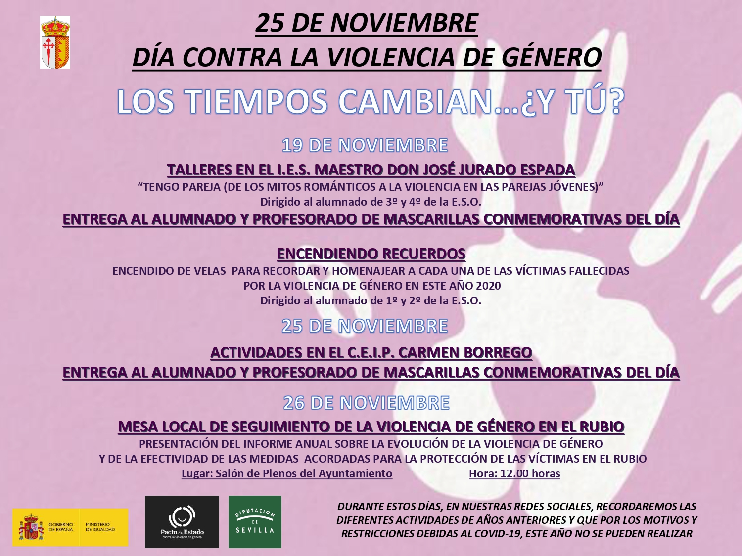 La Delegación de Igualdad del Ayuntamiento de El Rubio llevará a cabo distintas actividades en el IES Maestro Don José Jurado Espada y en el CEIP Carmen Borrego. Además, el día 26 de noviembre tendrá lugar una mesa local de seguimiento de la violencia de género en El Rubio.