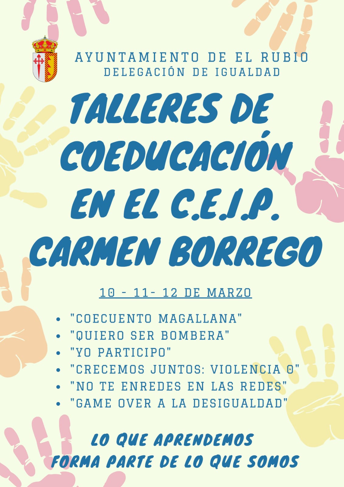 La Delegación de Igualdad del ayuntamiento de El Rubio ha organizado en el CEIP Carmen Borrego distintos TALLERES DE COEDUCACIÓN que se realizarán los días 10, 11 y 12 de marzo con motivo del Día Internacional de la Mujer.