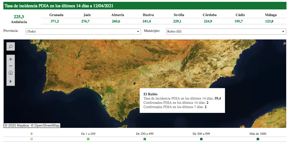 El Ayuntamiento de El Rubio informa que, hoy LUNES 12 de abril, el número de contagios activos por coronavirus en El Rubio, según los datos que ofrece la Consejería de Salud y Familias, asciende a 2 casos positivos en los últimos catorce días. La tasa de incidencia acumulada en los últimos 14 días es de 59,4 por cada cien mil habitantes.