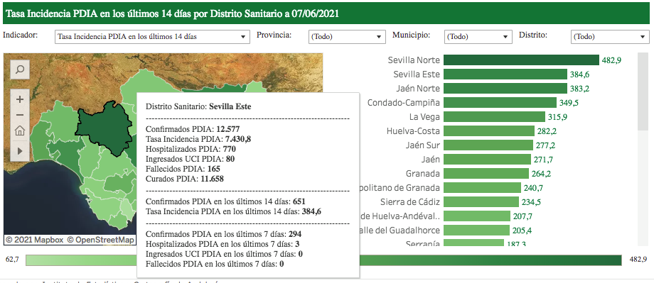 En el Distrito Sanitario Este, al que pertenece la localidad, se han disminuido levemente las cifras acumulando en los últimos 14 días 651 contagios, suponiendo una incidencia acumulada de 384,6 por cada cien mil habitantes.
