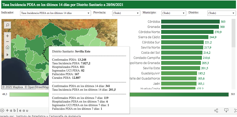 En el Distrito Sanitario Este, al que pertenece la localidad, continúan disminuyendo progresivamente las cifras acumulando en los últimos 14 días 341 contagios, lo que supone una incidencia acumulada de 201,5 por cada cien mil habitantes.