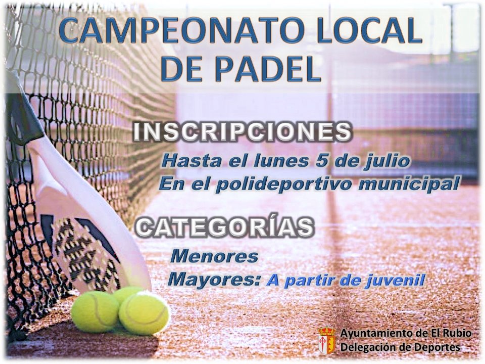 Abiertas las inscripciones hasta el próximo lunes 5 de julio para el CAMPEONATO LOCAL DE PADEL DE EL RUBIO. La Delegación de Deportes ha organizado la competición en dos categorías: una para menores y otra mayores (a partir de juvenil).