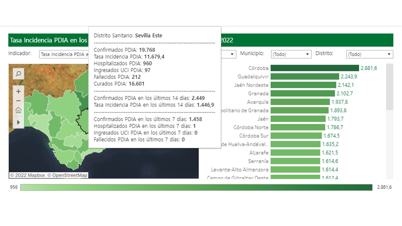 El Distrito Sanitario Este, al que pertenece la localidad, continúa disminuyendo las cifras de contagiados, acumulando en los últimos 14 días 1230 contagios, lo que supone una incidencia acumulada de 726,7 por cada cien mil habitantes.