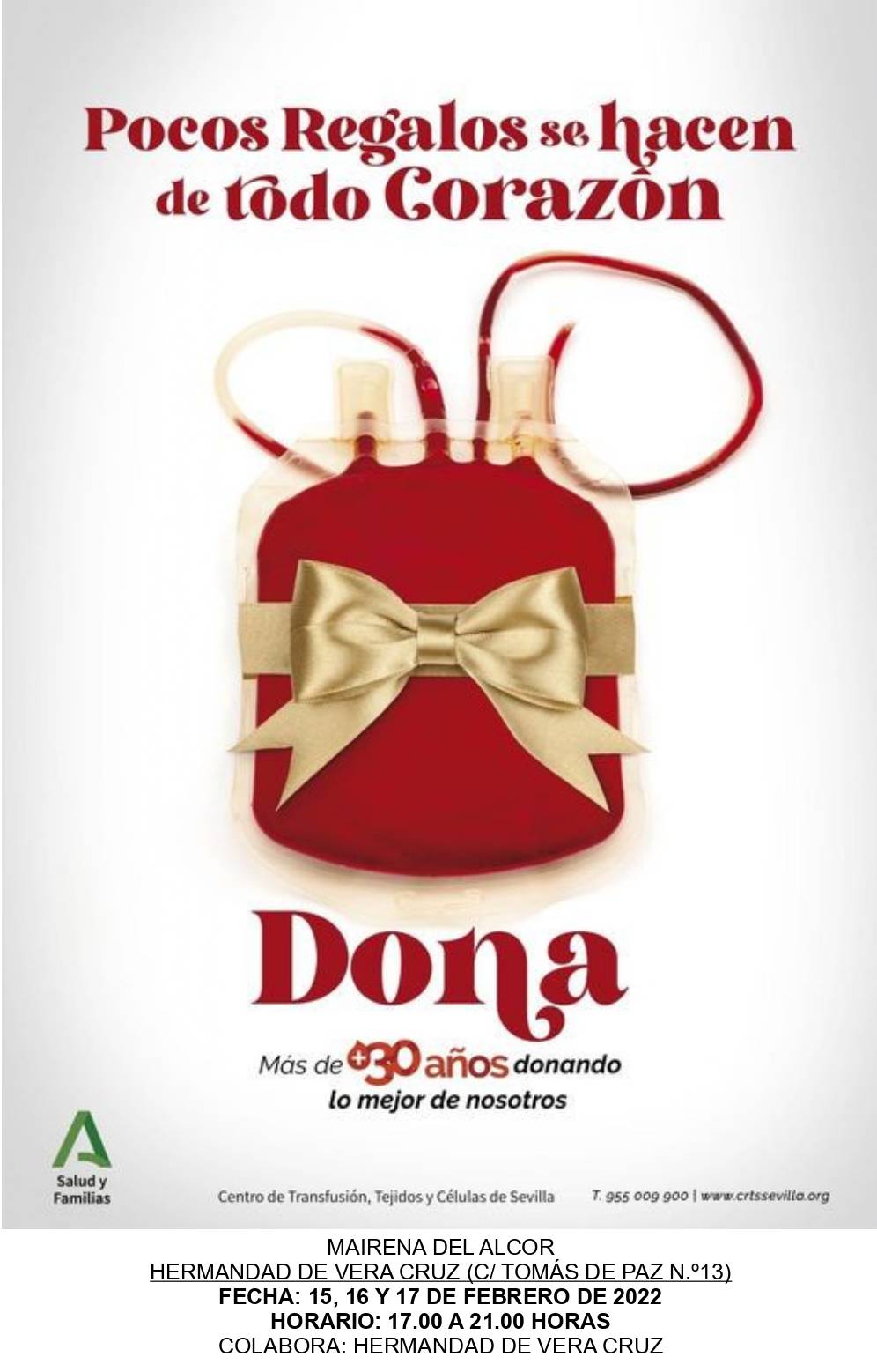 El Centro de Transfusión, Tejidos y Células de Sevilla organiza una nueva campaña de donación de sangre en la casa hermandad de la Vera Cruz (calle Tomás de Paz, 13) los días 15, 16 y 17 de febrero de 17.00 a 21.00 horas.