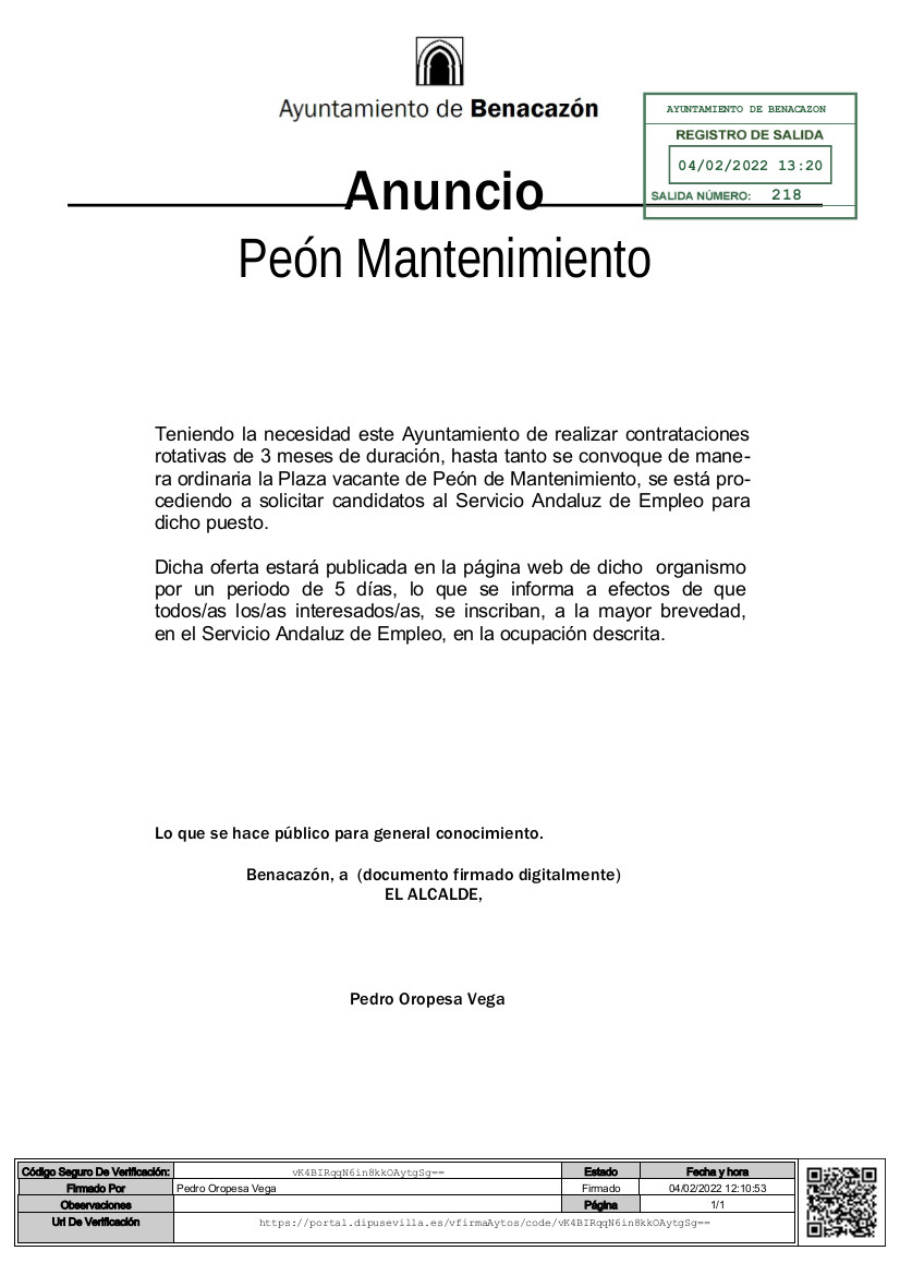 El Ayuntamiento de Benacazón informa que, teniendo la necesidad de realizar contrataciones rotativas de 3 MESES de duración, mientras tanto se convoque de manera ordinaria la Plaza vacante de Peón de Mantenimiento, se está procediendo a solicitar candidatos al Servicio Andaluz de Empleo para cubrir dicho puesto en la ocupación descrita.
