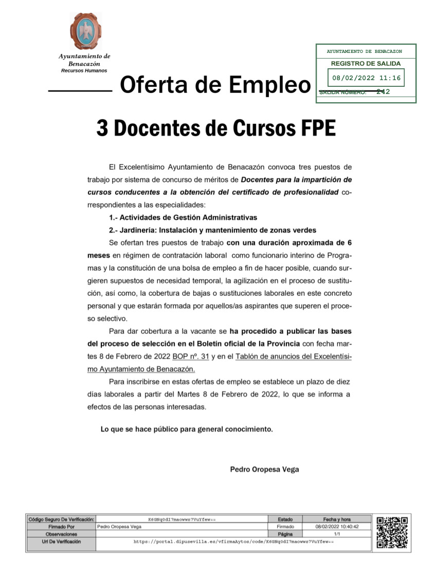 Para dar cobertura a las vacantes se ha procedido a publicar las Bases del proceso de selección en el BOP nº 31 de hoy martes 8 de febrero de 2022, que puedes consultar en el ENLACE que adjuntamos a continuación, y en el Tablón de Anuncios del Ayuntamiento de Benacazón.