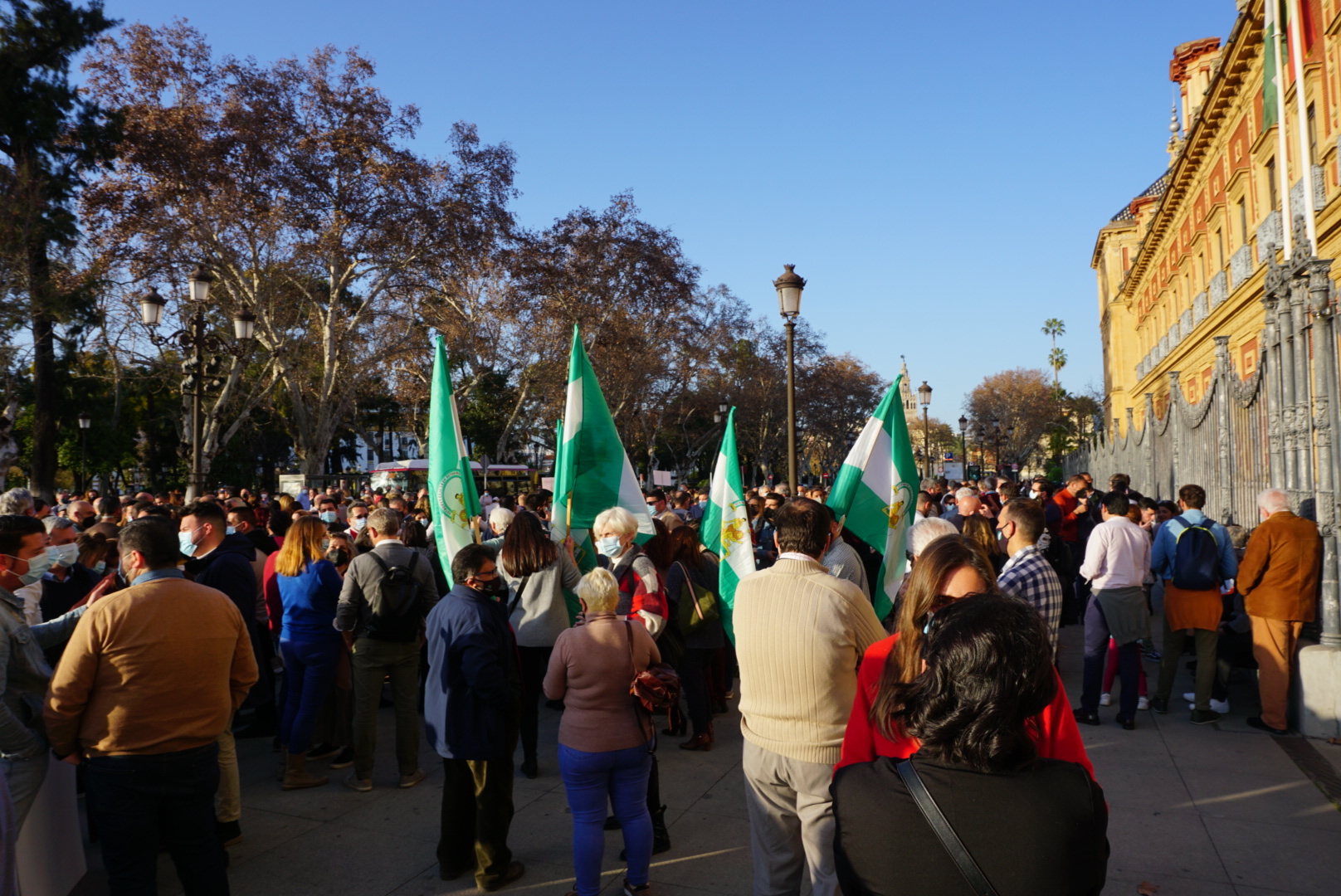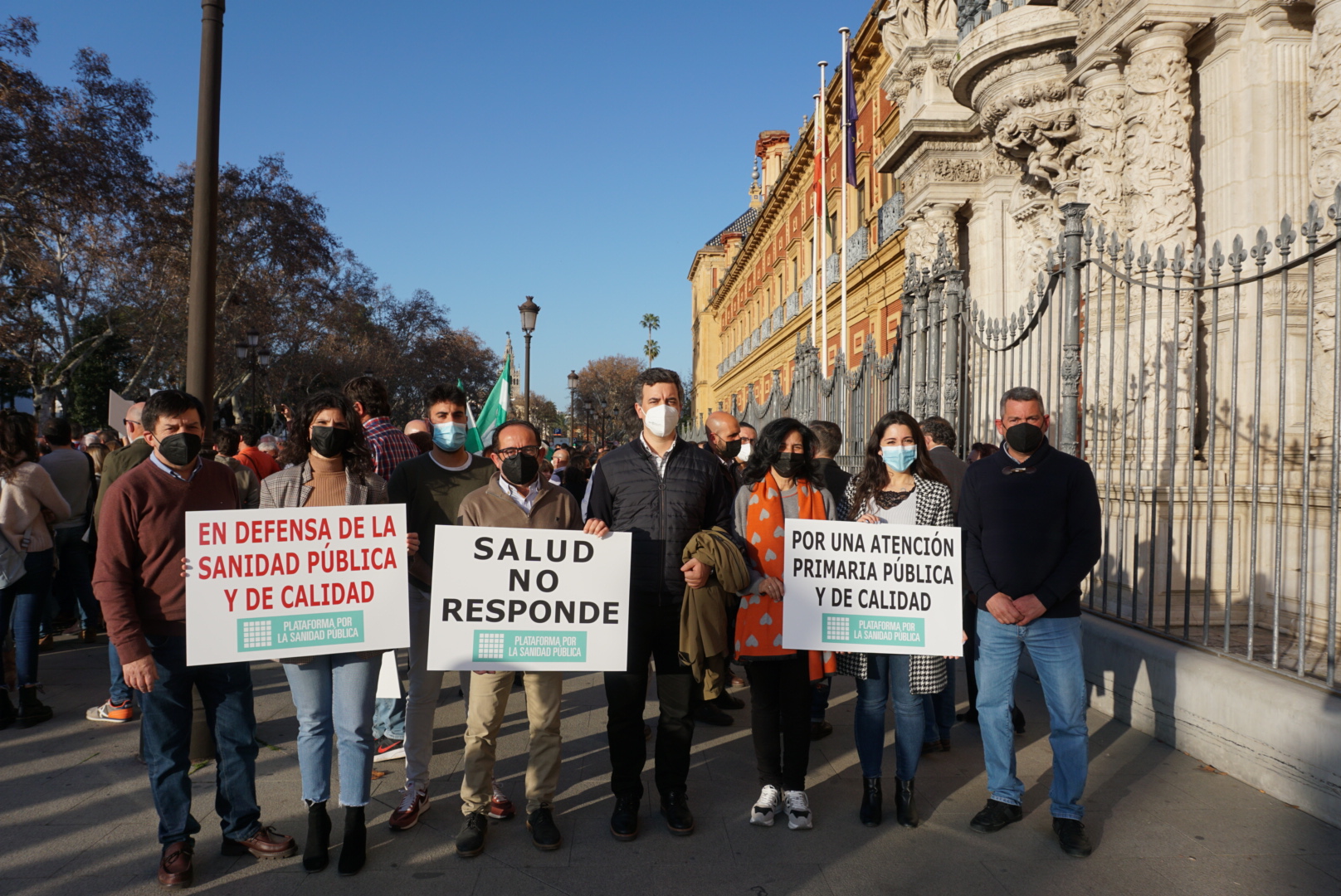 Alcaldes y alcaldesas junto a concejales de la provincia de Sevilla se concentraron ayer, 8 de Febrero, frente al Palacio de San Telmo de Sevilla en defensa de una sanidad pública y de calidad. Los motivos de la concentración son la falta de soluciones ante una situación en nuestra sanidad pública cada vez más preocupante.