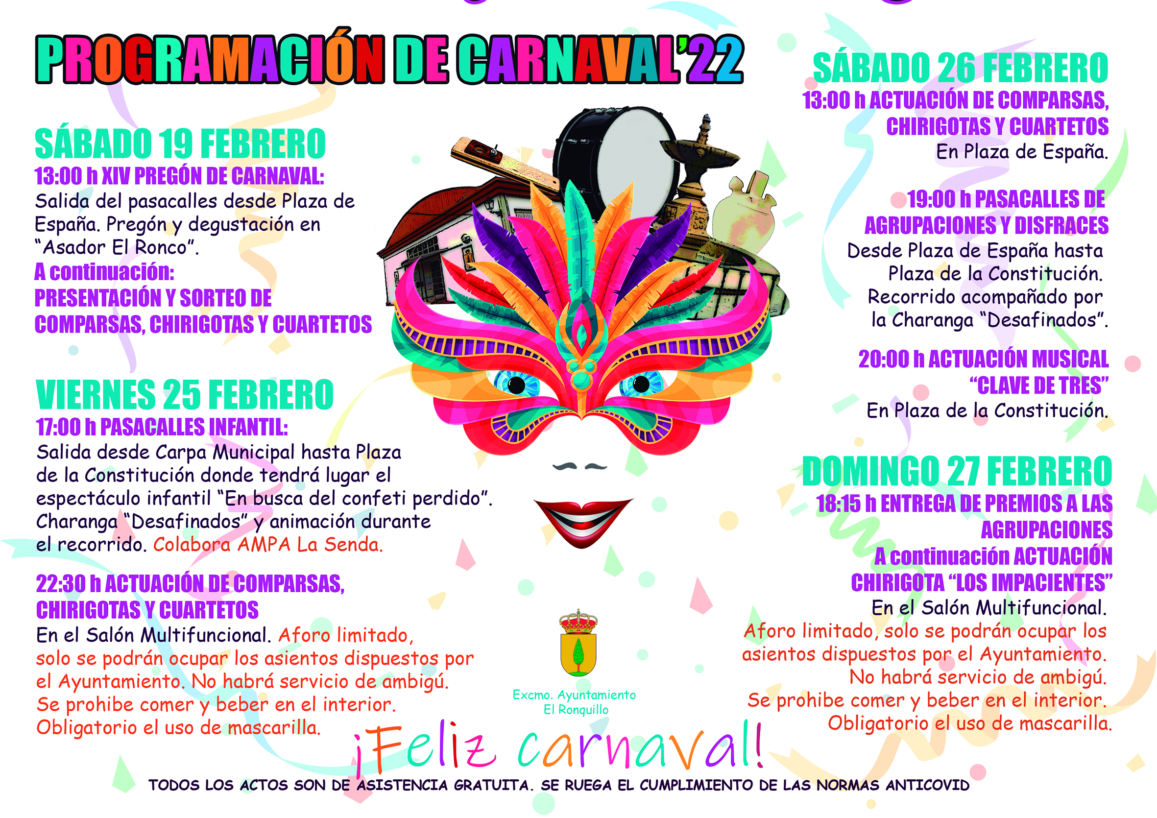 El Ayuntamiento presenta el Cartel Oficial y el Programa de Carnaval 2022 de El Ronquillo que celebraremos los días 25, 26 y 27 de febrero.