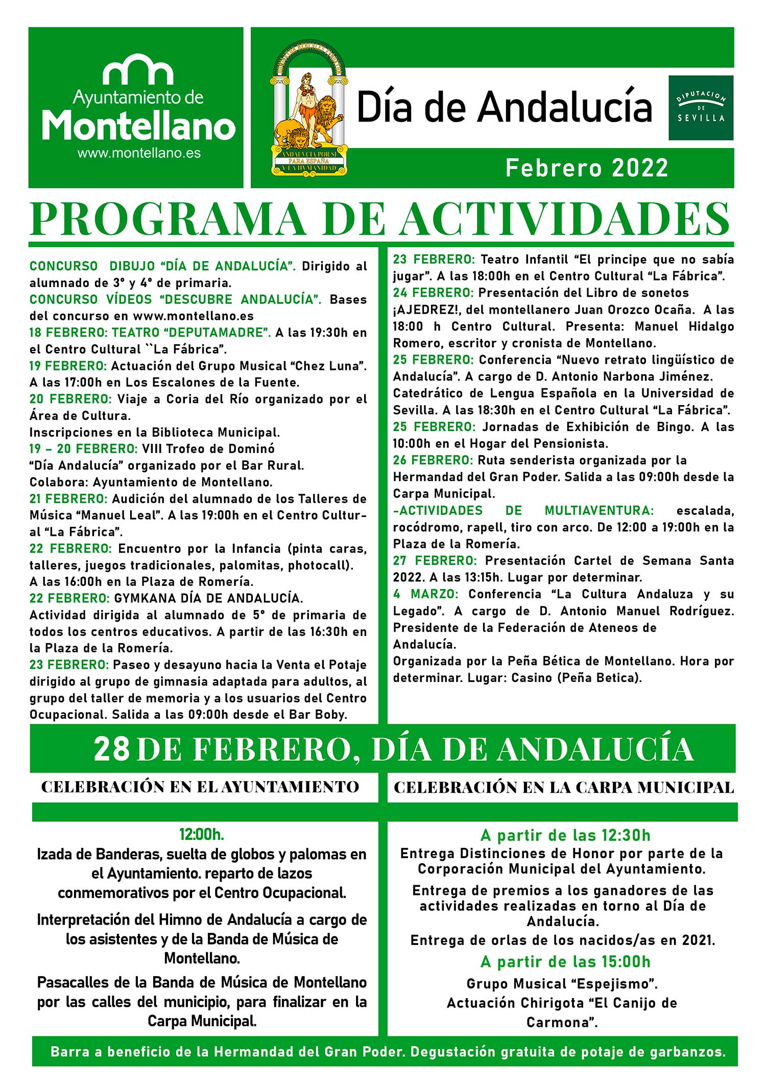 Ya para el día 28 de Febrero se celebrarán los actos principales con la tradicional izada de banderas y suelta de globos en el Ayuntamiento, el pasacalles de la Banda Municipal hasta la Carpa y la entrega de distinciones de Honor por parte de la Corporación Municipal. Ese día también se hará entrega de las orlas a los nacidos en Montellano en 2021 y se terminará con la degustación de un potaje de garbanzos y las actuaciones musicales del grupo "Espejismo" y la chirigota del Canijo de Carmona.