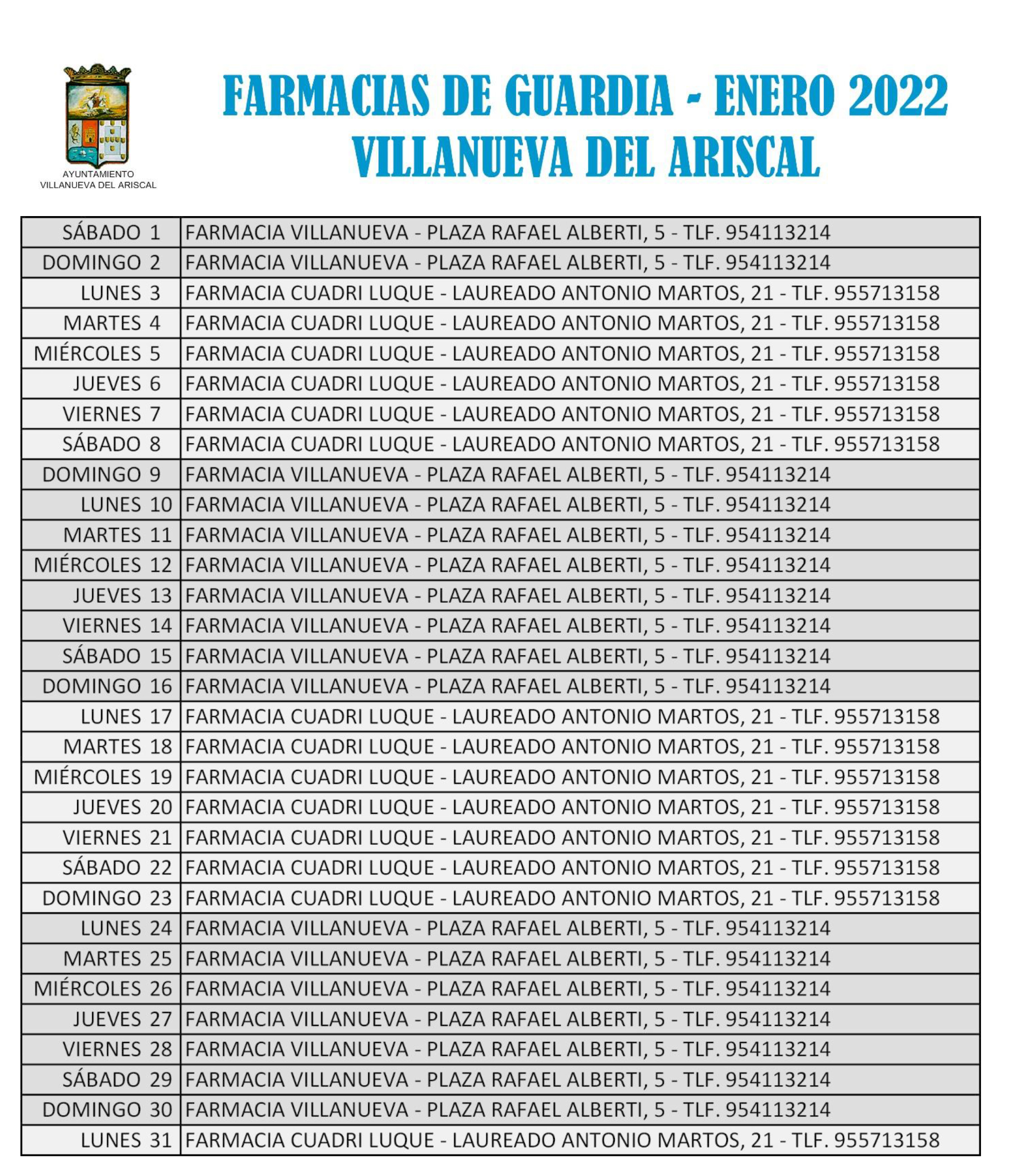 Aquí te dejamos las farmacias de guardia en nuestra localidad en este mes de enero.