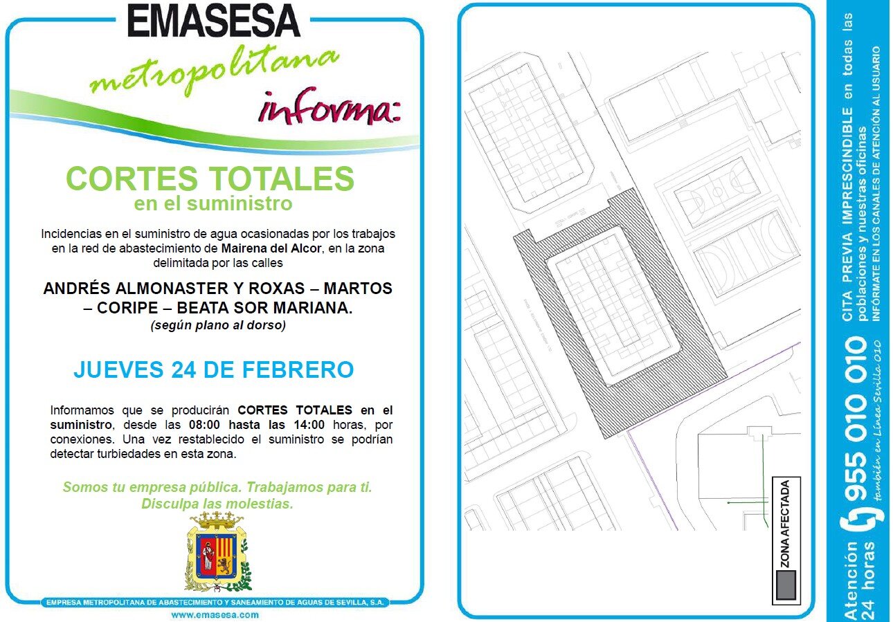 Emasesa Metropolitana informa que por trabajos en la red de abastecimiento, el jueves 24 de febrero de 8 a 14 horas, se producirán cortes totales en el suministro de agua en la zona comprendida por las calles Andrés Almonaster y Roxas, Martos, Coripe y Beata Sor Mariana.