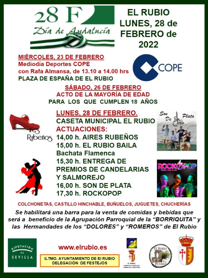 Vuelve el concurso de salmorejo rubeño, el acto de la mayoría de edad y las actuaciones de: AIRES RUBEÑOS, EL RUBIO BAILA, SON DE PLATA Y ROCOPOP