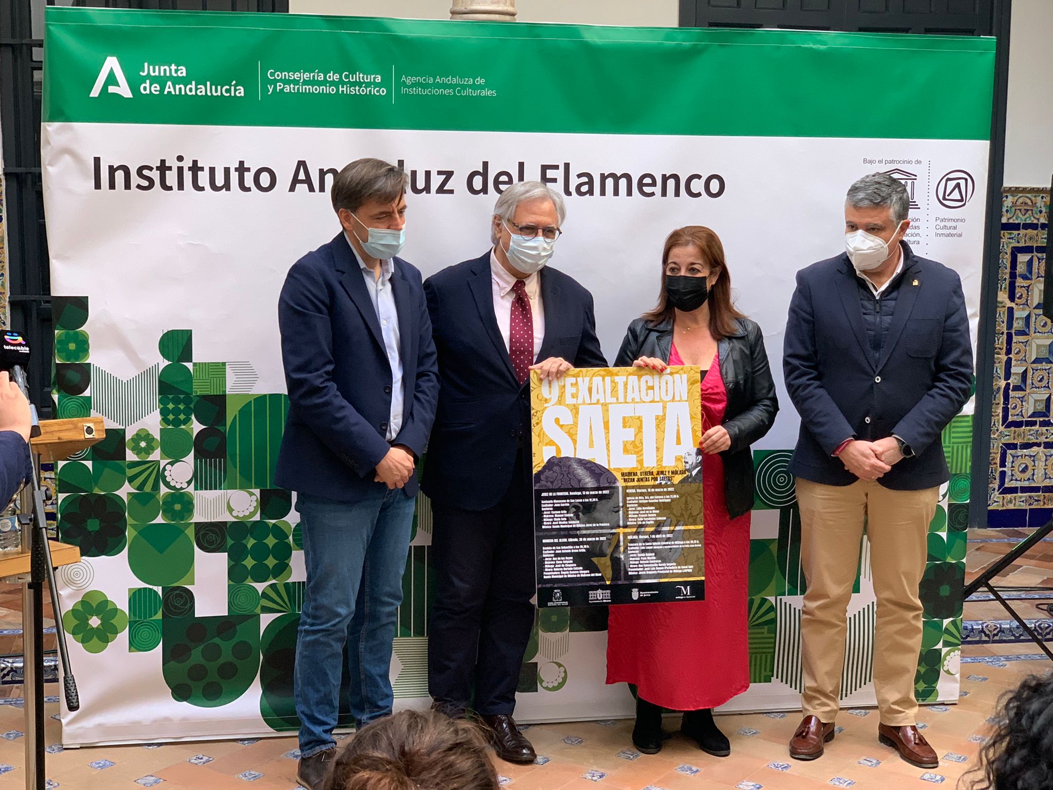 El alcalde de Mairena del Alcor, Juanma López, y la delegada de Flamenco, Gloria Guillén, han asistido a la presentación de la IX Exaltación de la Saeta 'Jerez, Utrera, Mairena y Málaga rezan juntas por saetas', esta mañana en la sede del Instituto Andaluz del Flamenco. Una Exaltación que organizan conjuntamente los ayuntamientos de las cuatro ciudades andaluzas.