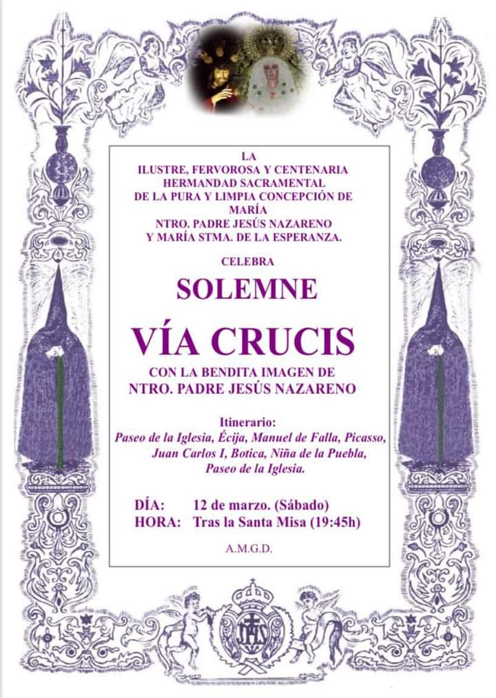 El sábado 5 de marzo la Ilustre y Fervorosa Hermandad Sacramental de la Pura y Limpia Concepción de María, Nuestro Padre Jesús Nazareno y María Santísima de la Esperanza presentó el cartel anunciador del Vía Crucis de Nuestro Padre Jesus Nazareno en su Casa Hermandad a las 8 de la tarde.