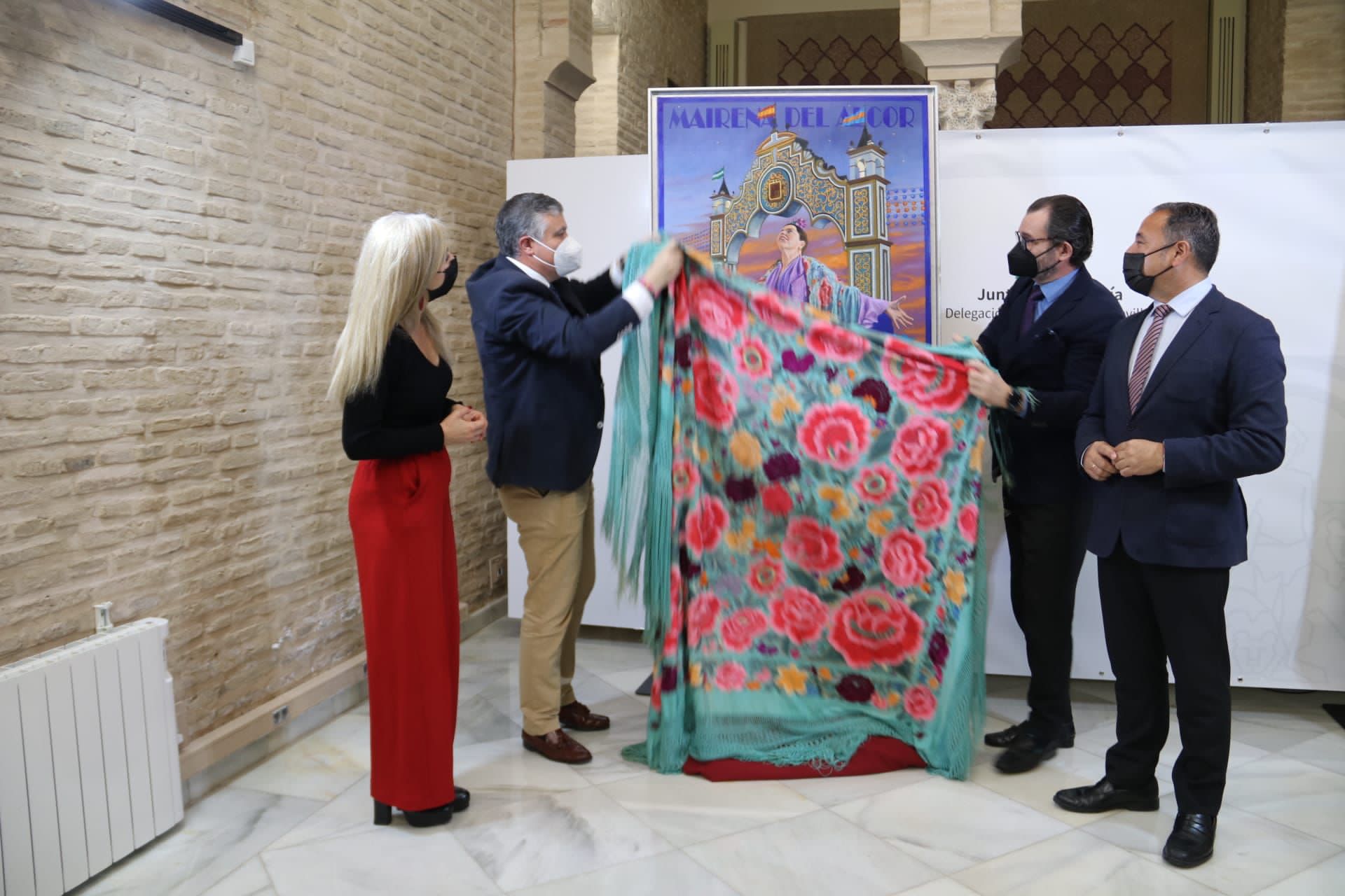 La consejera de Cultura y Patrimonio Histórico, Patricia del Pozo, ha presidido esta mañana la presentación del cartel anunciador de la Feria de Abril de Mairena del Alcor, tradicional primera cita ferial del año en Andalucía que, además, es la más antigua ya que este año alcanza su 581ª Edición. Junto a la consejera han estado el delegado del Gobierno, Ricardo Sánchez, y el alcalde de la localidad, Juanma López. La feria de Mairena, que este año contará excepcionalmente con un día más, se celebrará del 20 al 24 de abril.