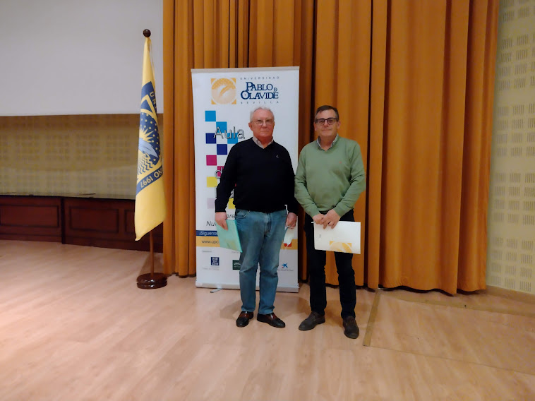 Los alumnos Fernando Hernández y Aniceto Gassó del Aula Abierta de Mayores de Mairena del Alcor fueron los ponentes del trabajo 'Mairena del Alcor, ayer y hoy (ss. XX y XXI)', ayer martes 15 de marzo por la mañana en el Paraninfo de la UPO. Una temática relacionada con la evolución del municipio, desde diferentes perspectivas, tales como la arquitectura, la economía, las fiestas y las tradiciones, entre otras.