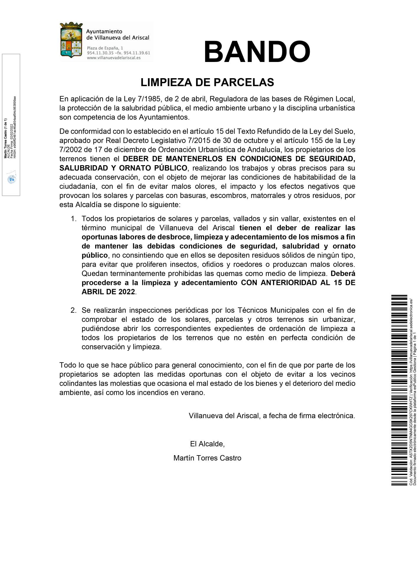 Aquí os dejamos este Bando informativo sobre la limpieza de parcelas.